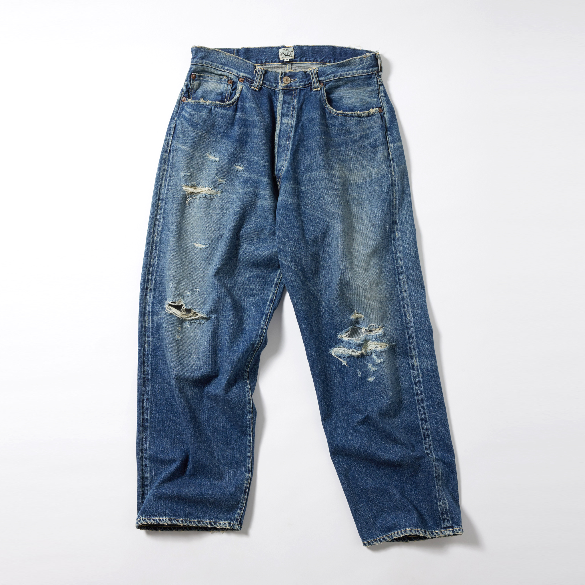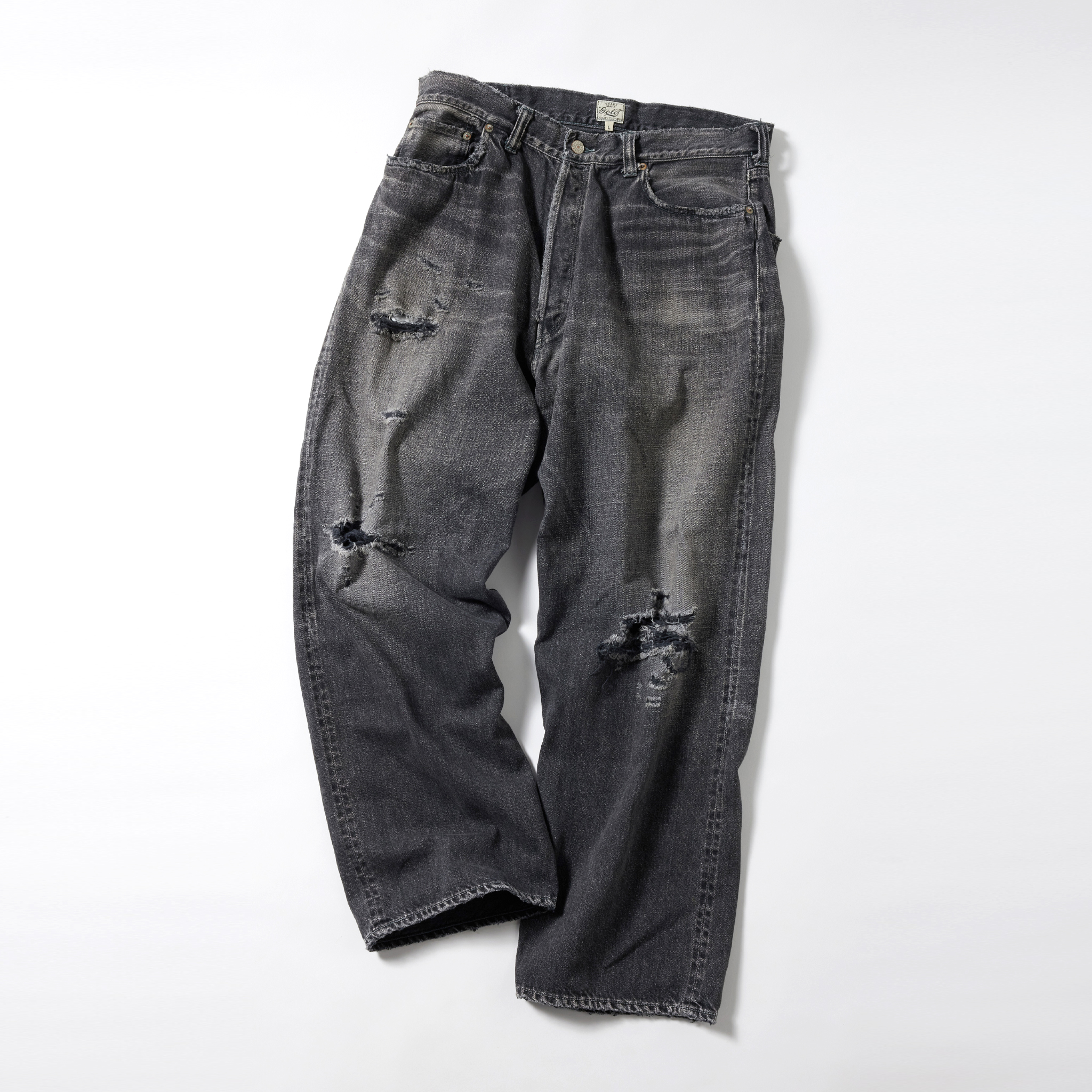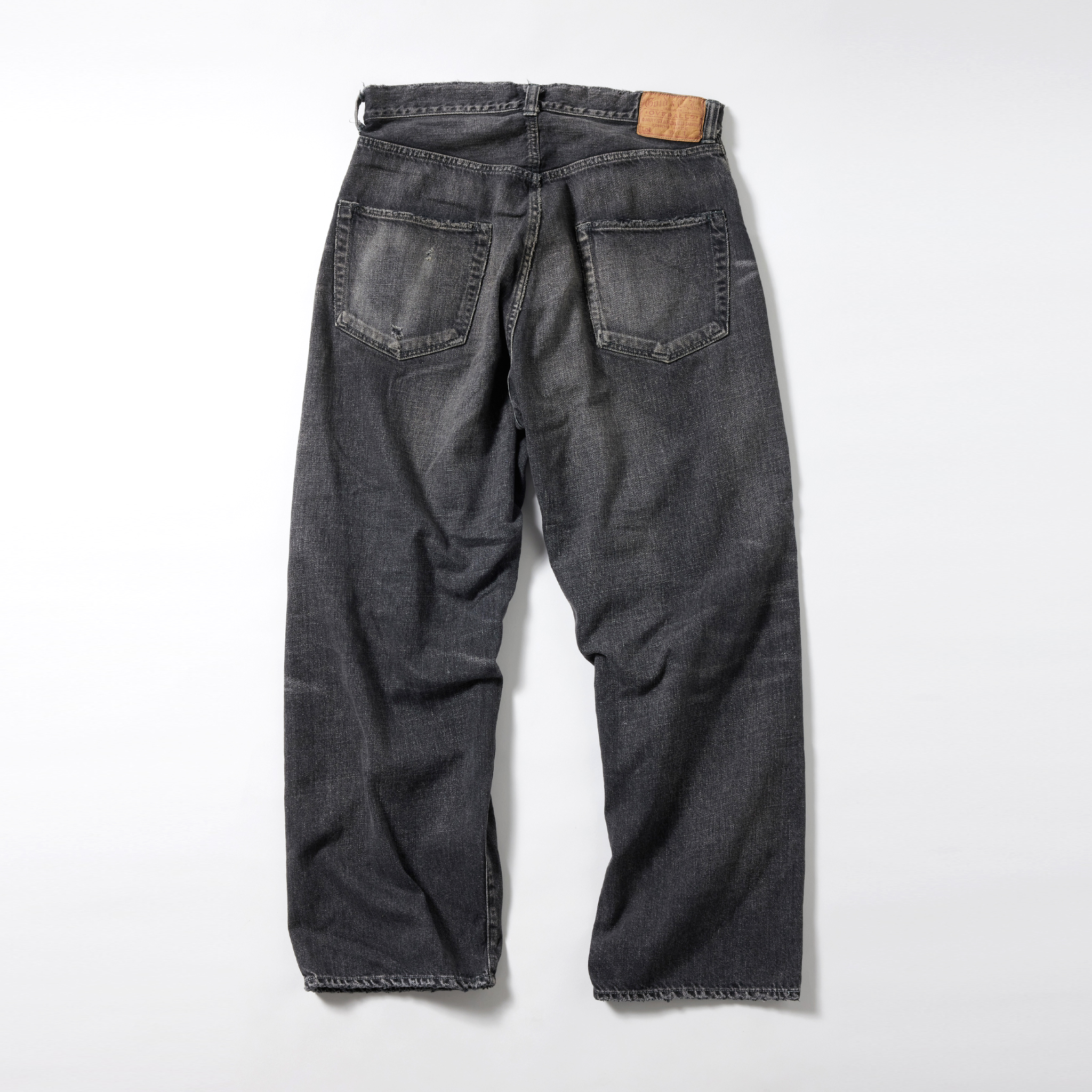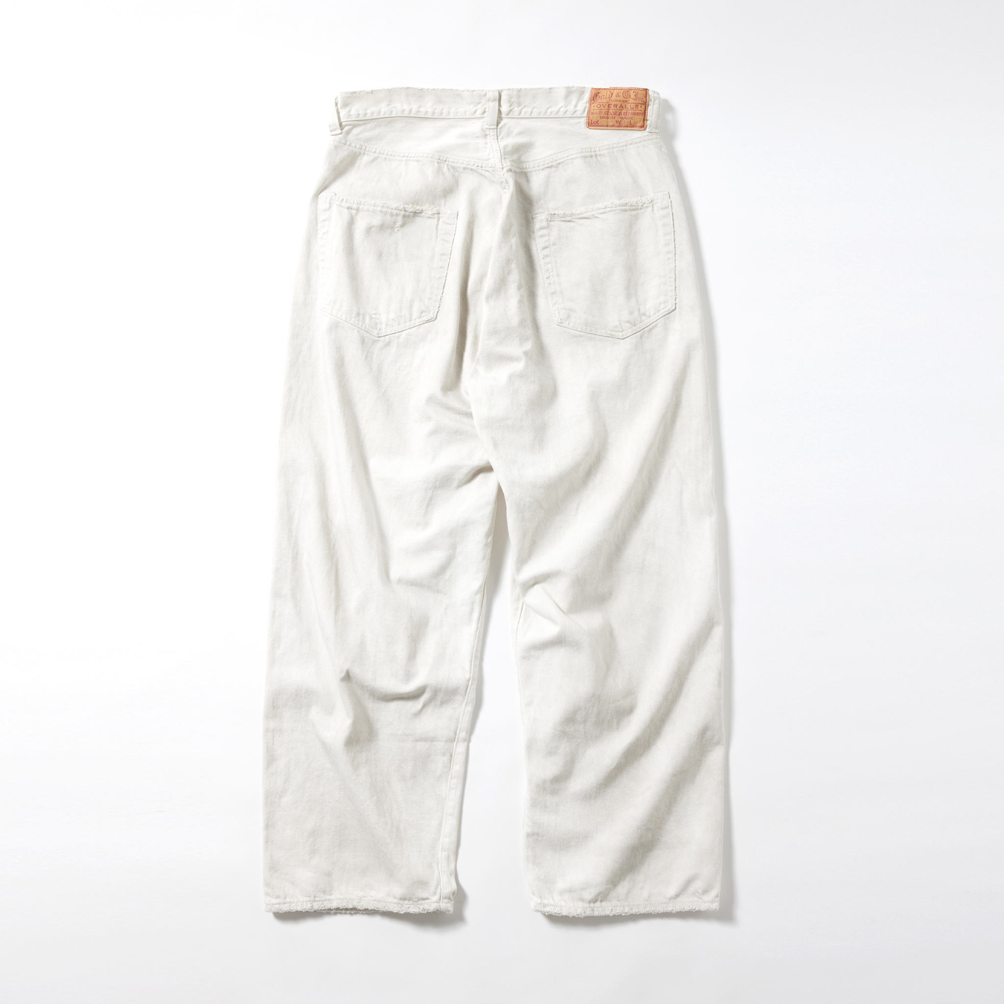 紡績の際、より均一な糸にする為に短いワタや毛羽を削ぎ落とす工程で落ちた超長綿の最高級スビン綿のみを別で収集し、通常のスビン綿と混ぜて作ったオリジナルのデニム生地。 タテ糸7番×ヨコ糸9番の糸をシャトル織機で織り上げた11.5オンスのセルビッジデニムは、落ちワタのムラ感やネップが特徴的で、スビン綿ならではの滑りや肌触りに優れている。 型は5ポケットパンツの完成型と呼ばれる1947年のモデルを踏襲。ヴィンテージをもとに色落ちやダメージ、リペアを施している。コインポケット口やサイドシームのセルビッジ使い、隠しリベット付きのディテールや縫製仕様もヴィンテージ同様。腰周りやワタリを広めに設定したワイドストレートモデル。