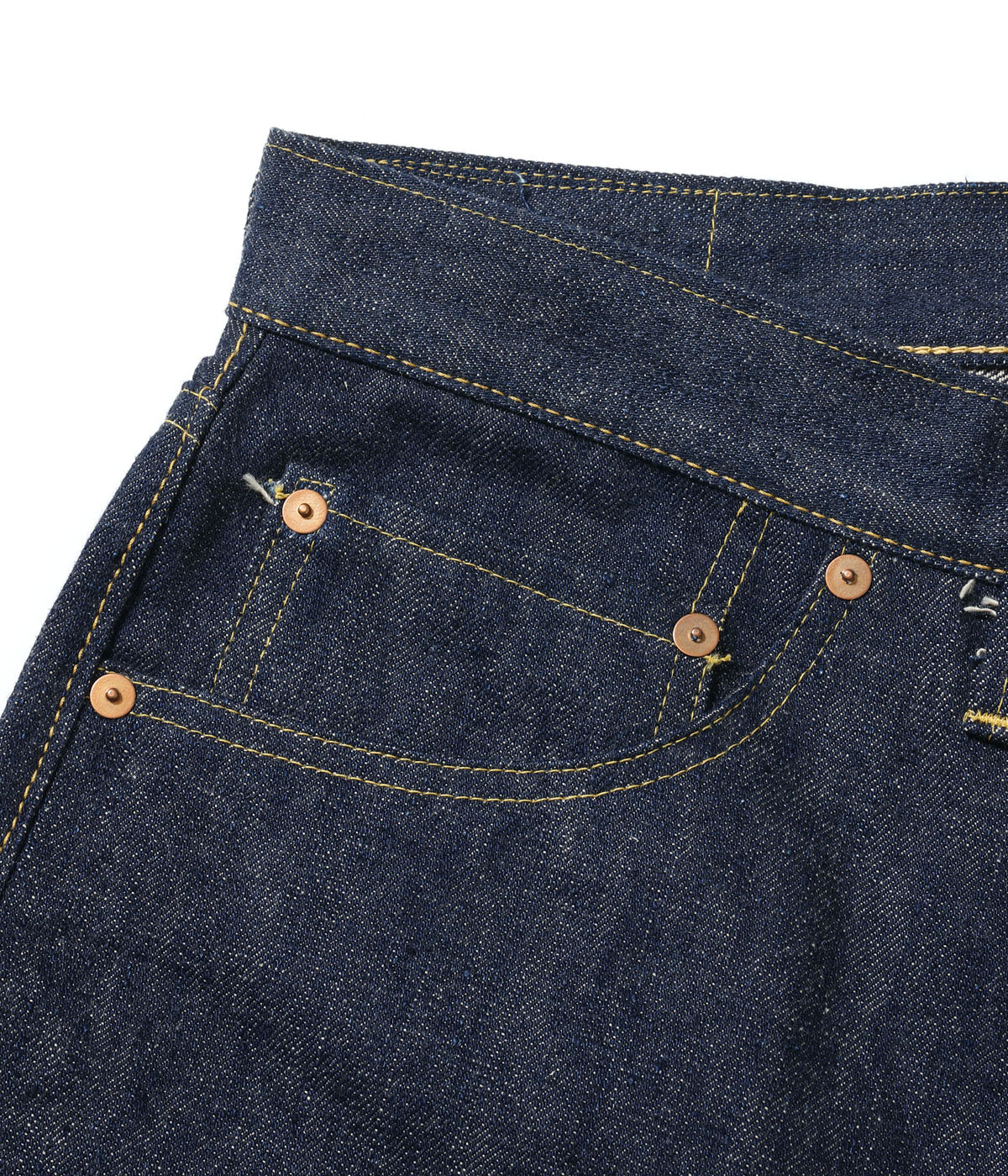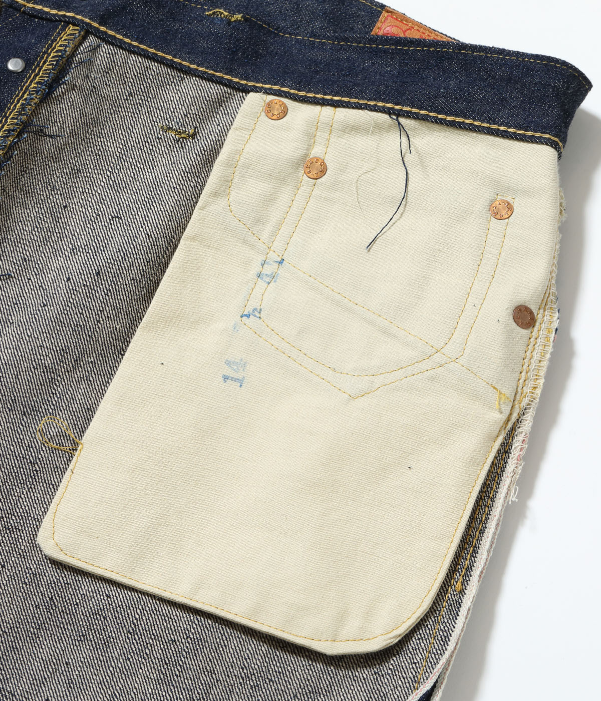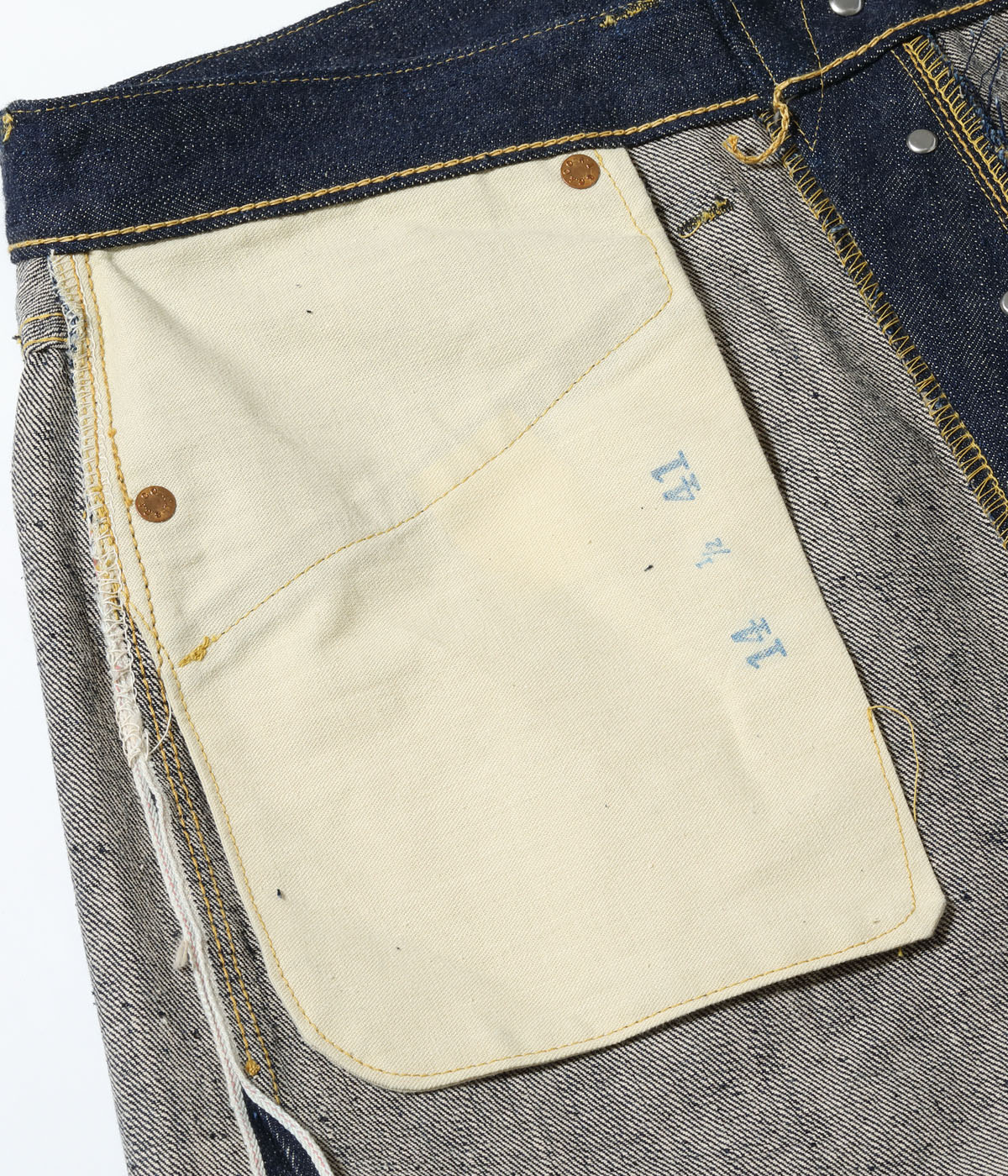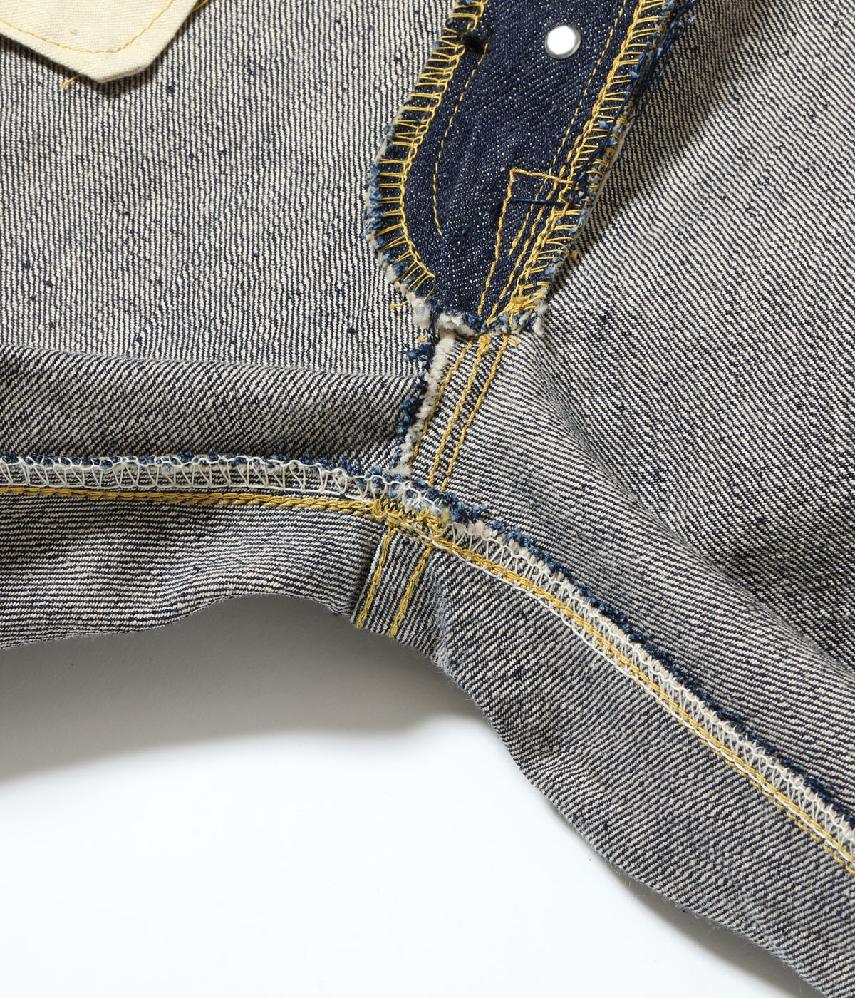 品番の頭に「S」が付いているにもかかわらず、コインポケットにリベットが打ち込まれた1945年後期頃のウエストオーバーオールズ。ボタンはトップ、フライ共にロゴ入りの鉄製タックボタンで、リベットは無地の鉄リベットを使用している。もとにしたヴィンテージはノンウォッシュのミントコンディション。品番の後ろに「A」がスタンプされた非常に希少な個体で、「A」の付くヴィンテージはこれまで世界でも2本しか確認されていない。生地はムラが強く荒々しい14オンスのデニム。持ち出しや向布などの地の目の向きがイレギュラーで、縫製もコインポケットの先端のステッチが少しこぼれてしまっているなど、「大戦モデル」らしい粗野な作りが特徴。