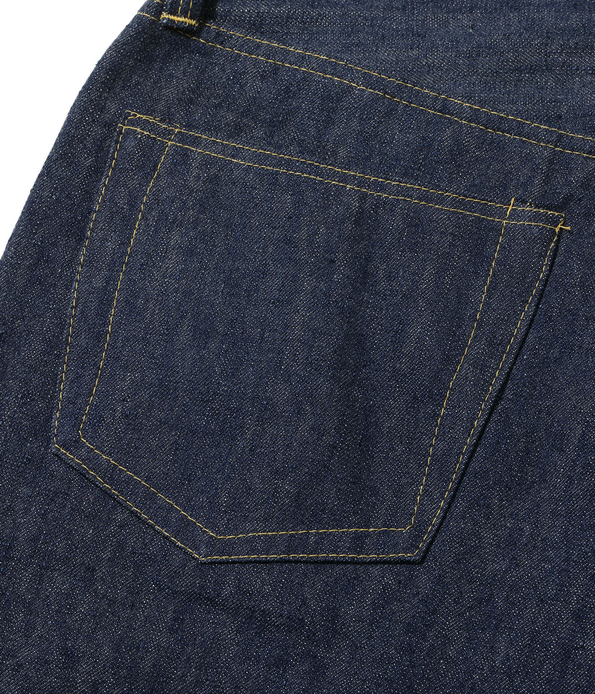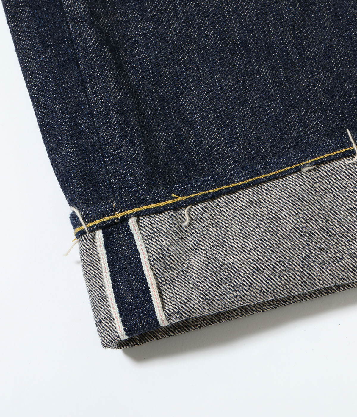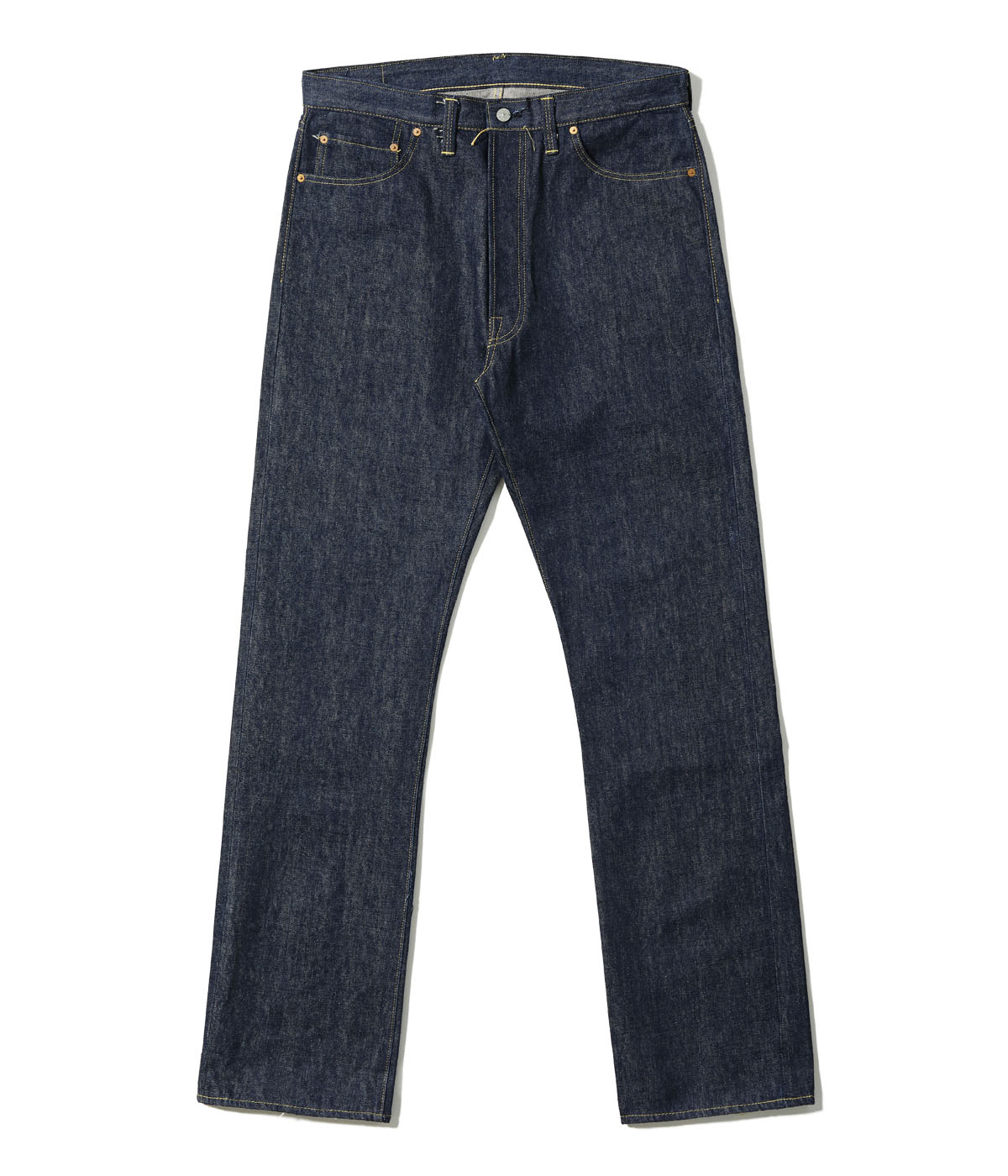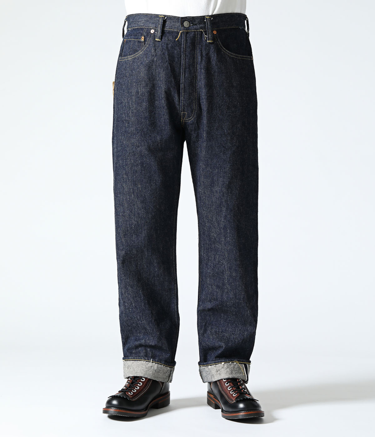 品番の頭に「S」が付いているにもかかわらず、コインポケットにリベットが打ち込まれた1945年後期頃のウエストオーバーオールズ。ボタンはトップ、フライ共にロゴ入りの鉄製タックボタンで、リベットは無地の鉄リベットを使用している。もとにしたヴィンテージはノンウォッシュのミントコンディション。品番の後ろに「A」がスタンプされた非常に希少な個体で、「A」の付くヴィンテージはこれまで世界でも2本しか確認されていない。生地はムラが強く荒々しい14オンスのデニム。持ち出しや向布などの地の目の向きがイレギュラーで、縫製もコインポケットの先端のステッチが少しこぼれてしまっているなど、「大戦モデル」らしい粗野な作りが特徴。