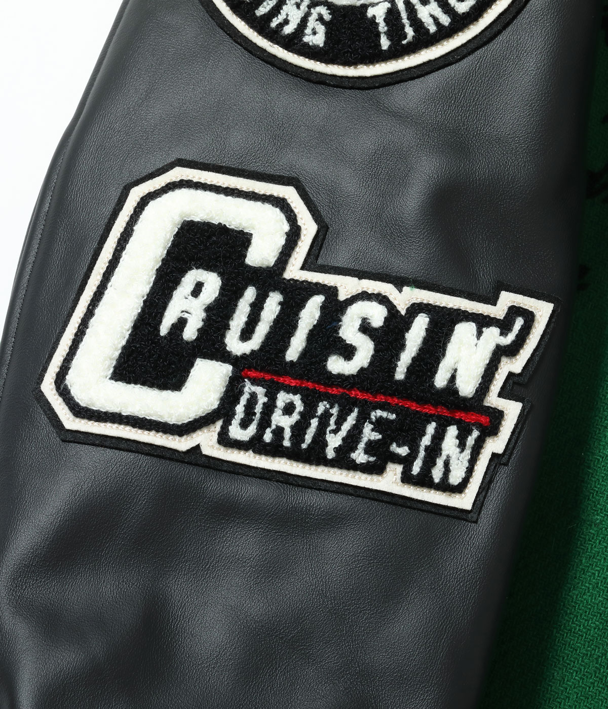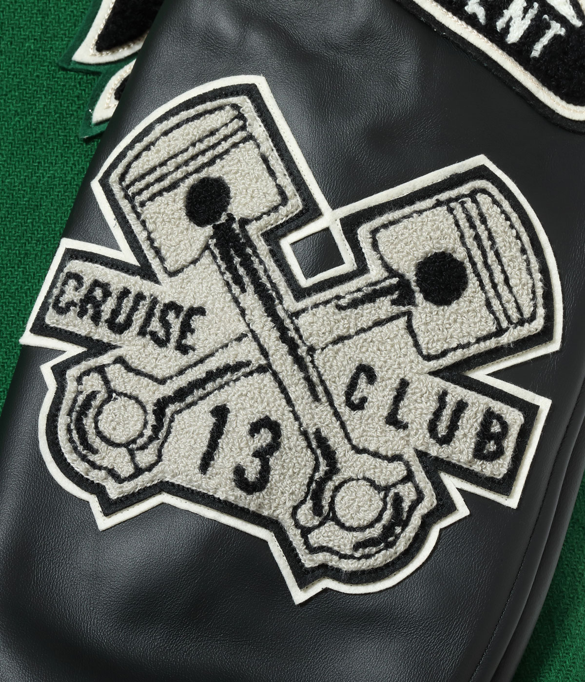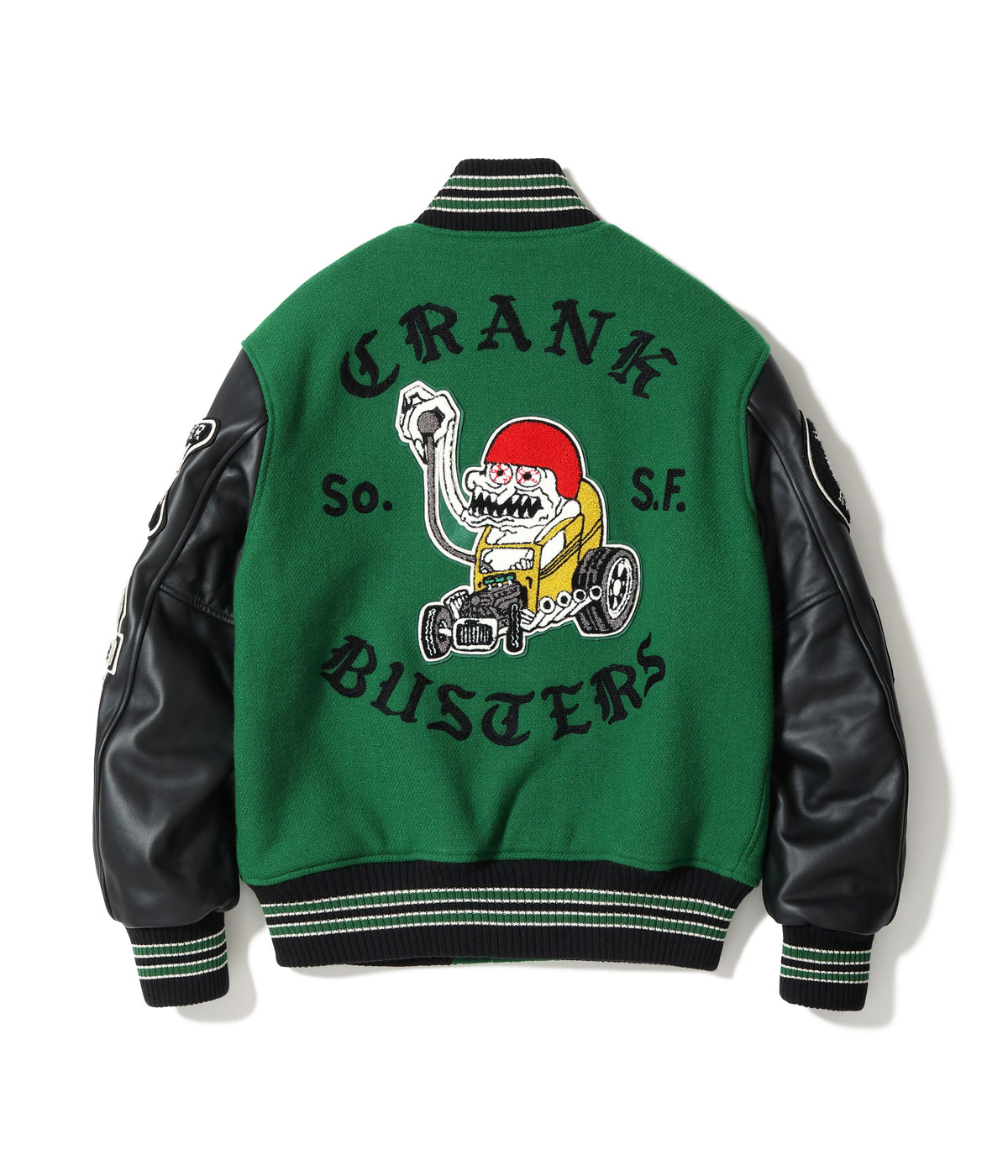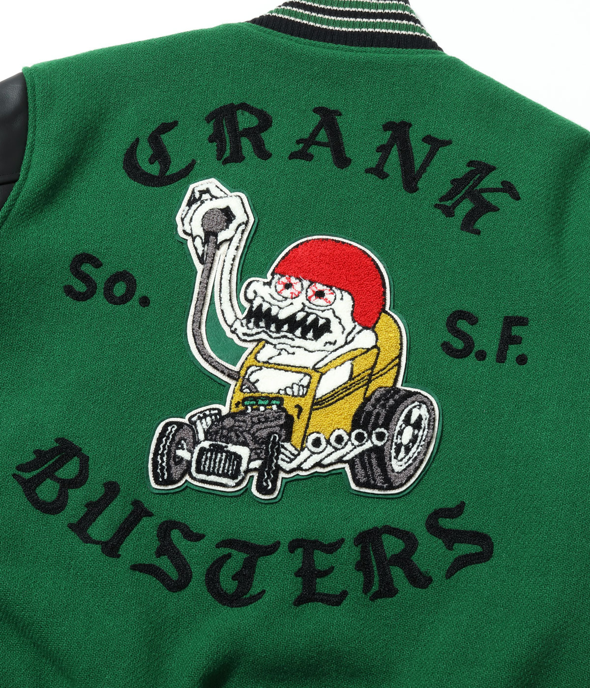 血眼になりカスタムカーで暴走するモンスターのシニールが、通常のアワードジャケットとは異彩な雰囲気を放つ作品。しかし、このようなデザインはカークラブジャケットという側面も持つアワードジャケットのモチーフとしても非常に好相性。所属するクラブチームで同じユニフォームを仕立てる文化は、他にアメリカのボウリングシャツなどにもみられる。