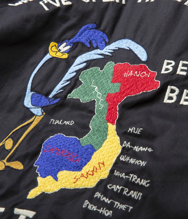 1967年から1969年の間、ベトナムに駐留していた米兵がカスタムオーダーし、アメリカ本国へ持ち帰った作品。 地名が入った王道のベトナムマップと、本人が愛していたロードランナーが、絶妙なレイアウトで描かれている。 背中のベトナム戦争のやるせなさをつづった英文のメッセージと、笑顔のロードランナーが実に対照的な一着。 胸に施された「福」の文字が2色使いで構成されている点も特徴的で、縁起の良さを感じさせる。