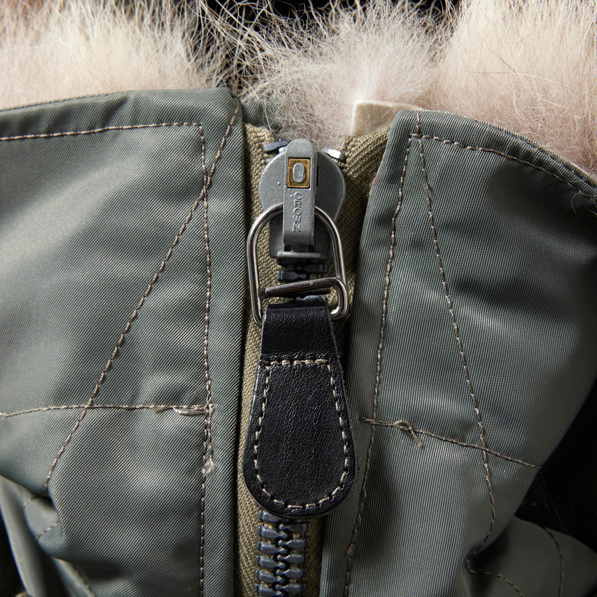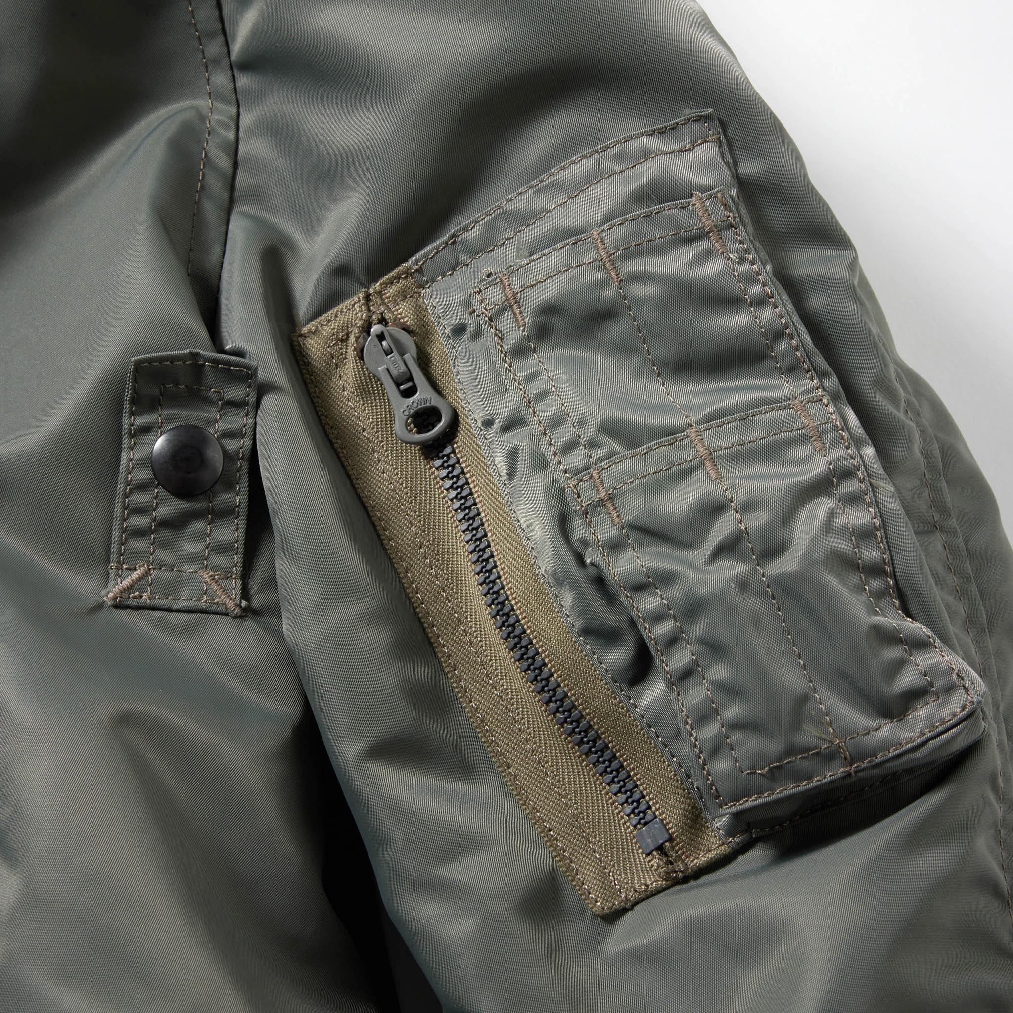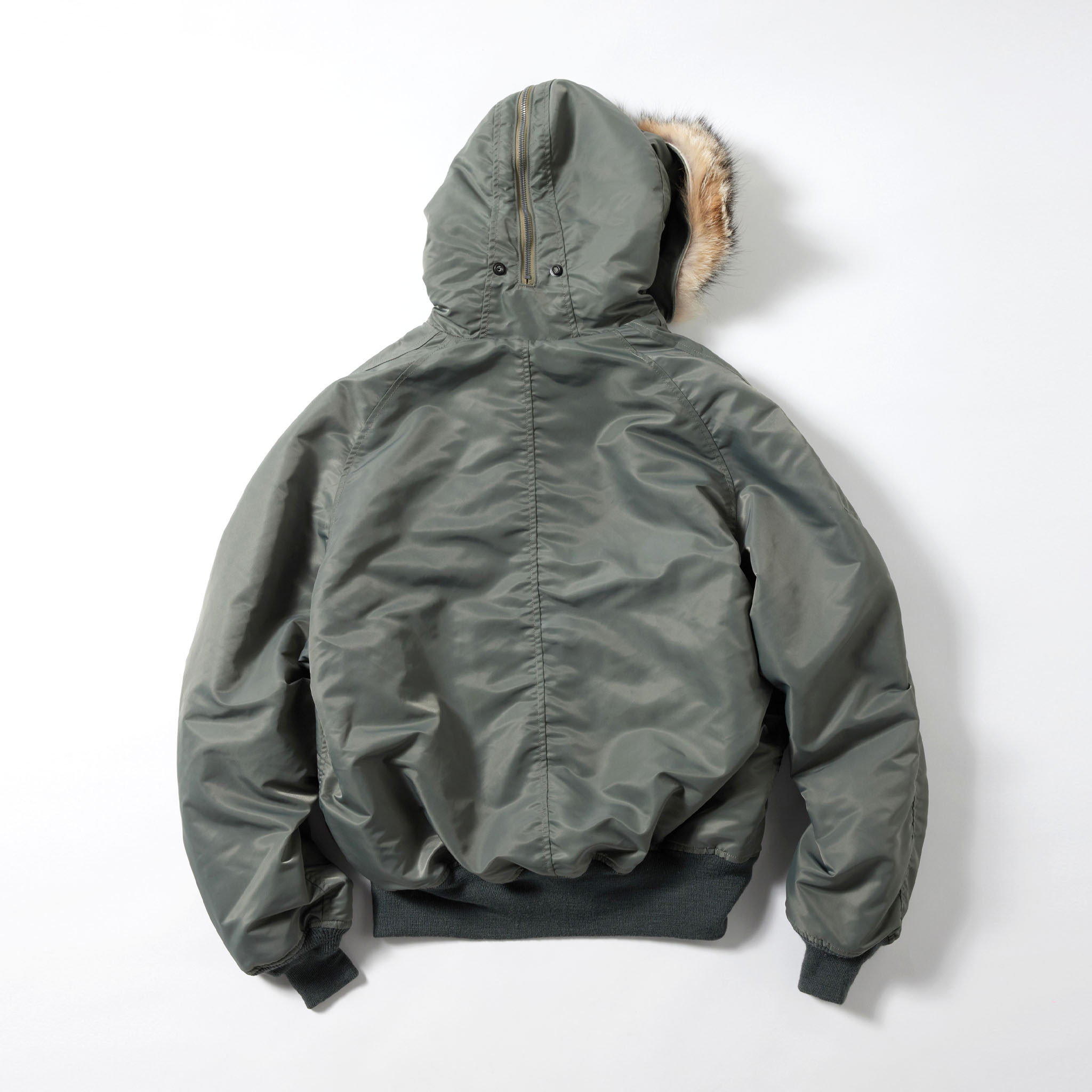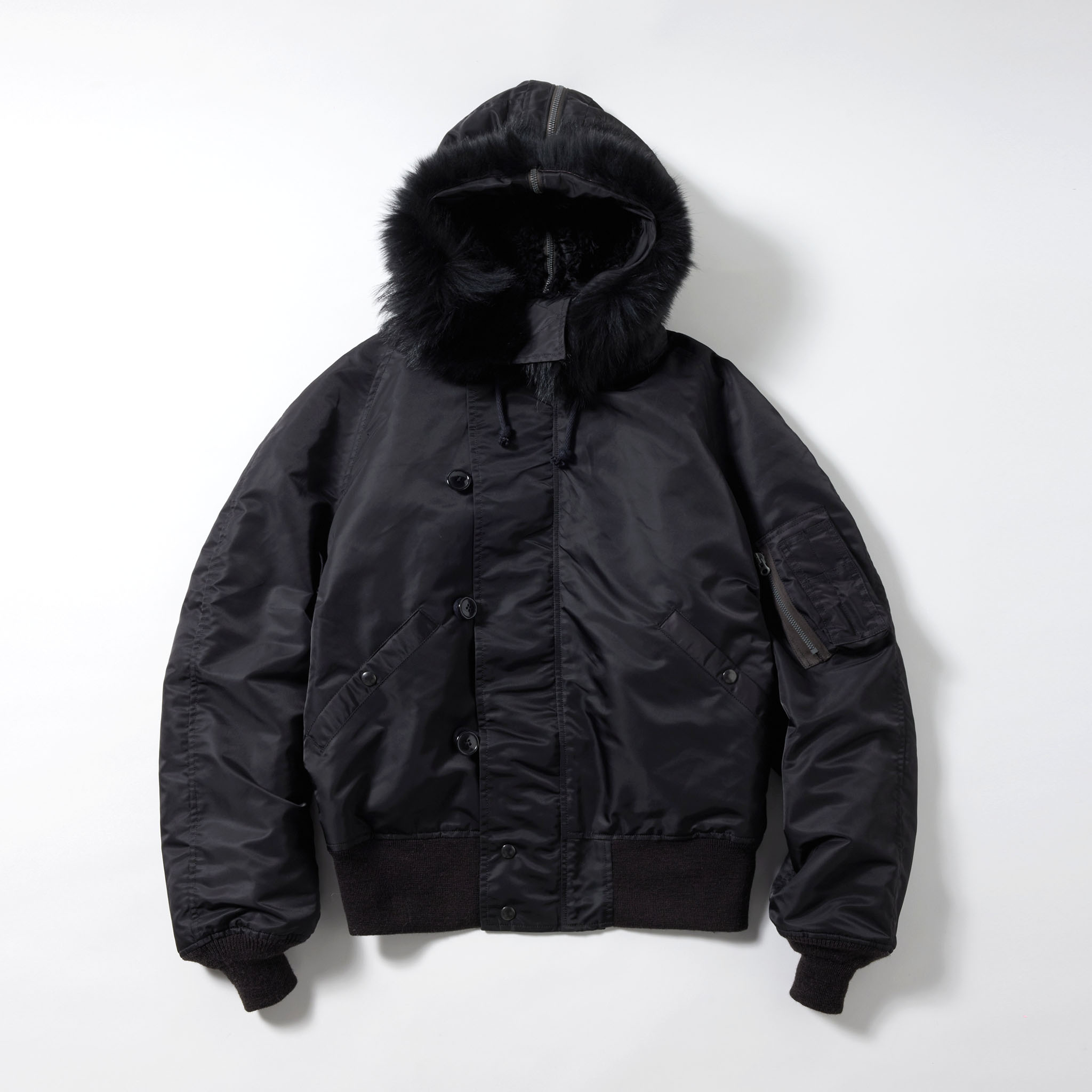 ヴィンテージの生地を分析して開発した、無撚糸で光沢感とハリ感のあるオリジナルのヘビーナイロンツイルを使用したN-2B。ヴィンテージ同様のCROWNファスナーはアルミ合金のスライダー、エレメント部分は一般的なプレス式ではなく高圧鋳造法を用いているため滑りが良い仕上がりとなっている。リブもヴィンテージ同様に輪編みのウールリブを採用。中綿にはウールパイルではなくCLIMASHIELD(クライマシールド)を使用することにより、軽量で保温性も完備。