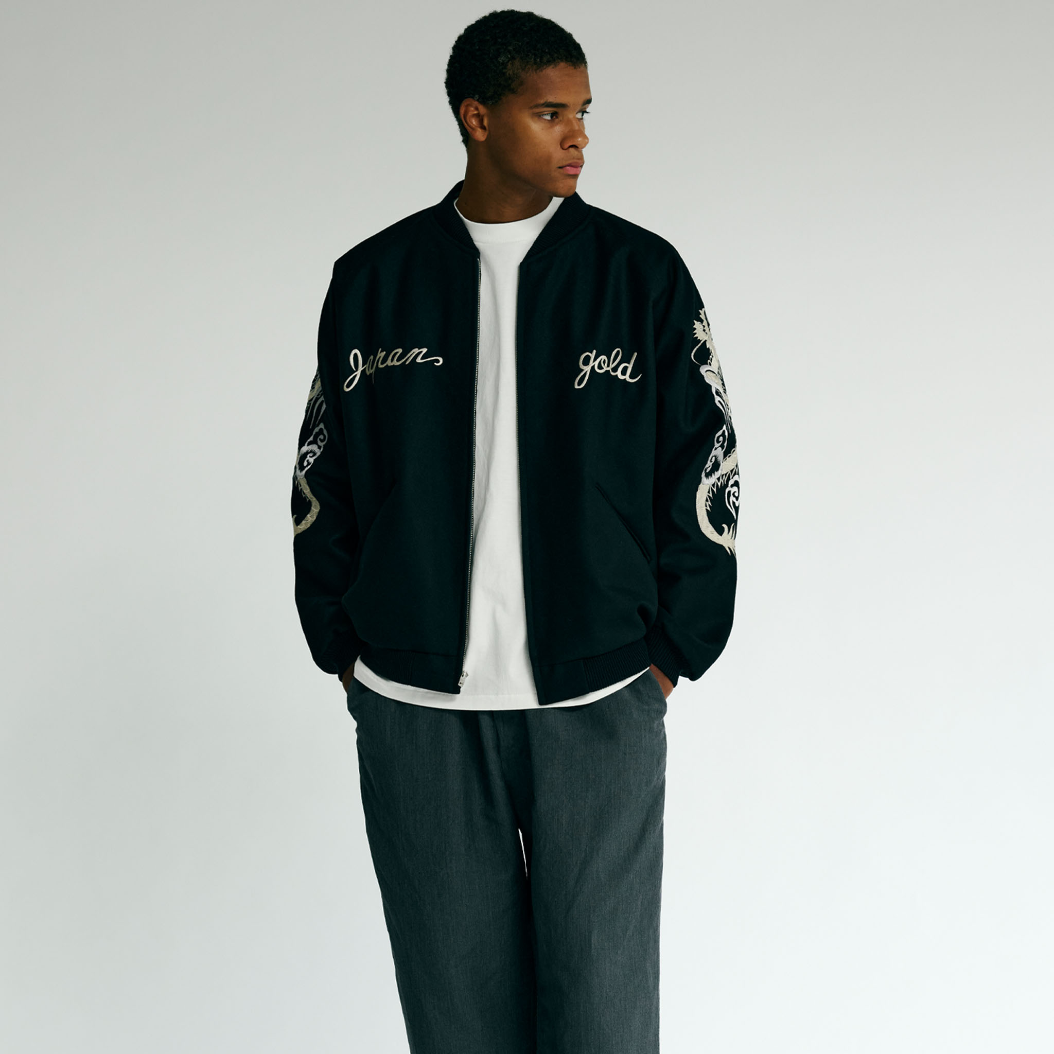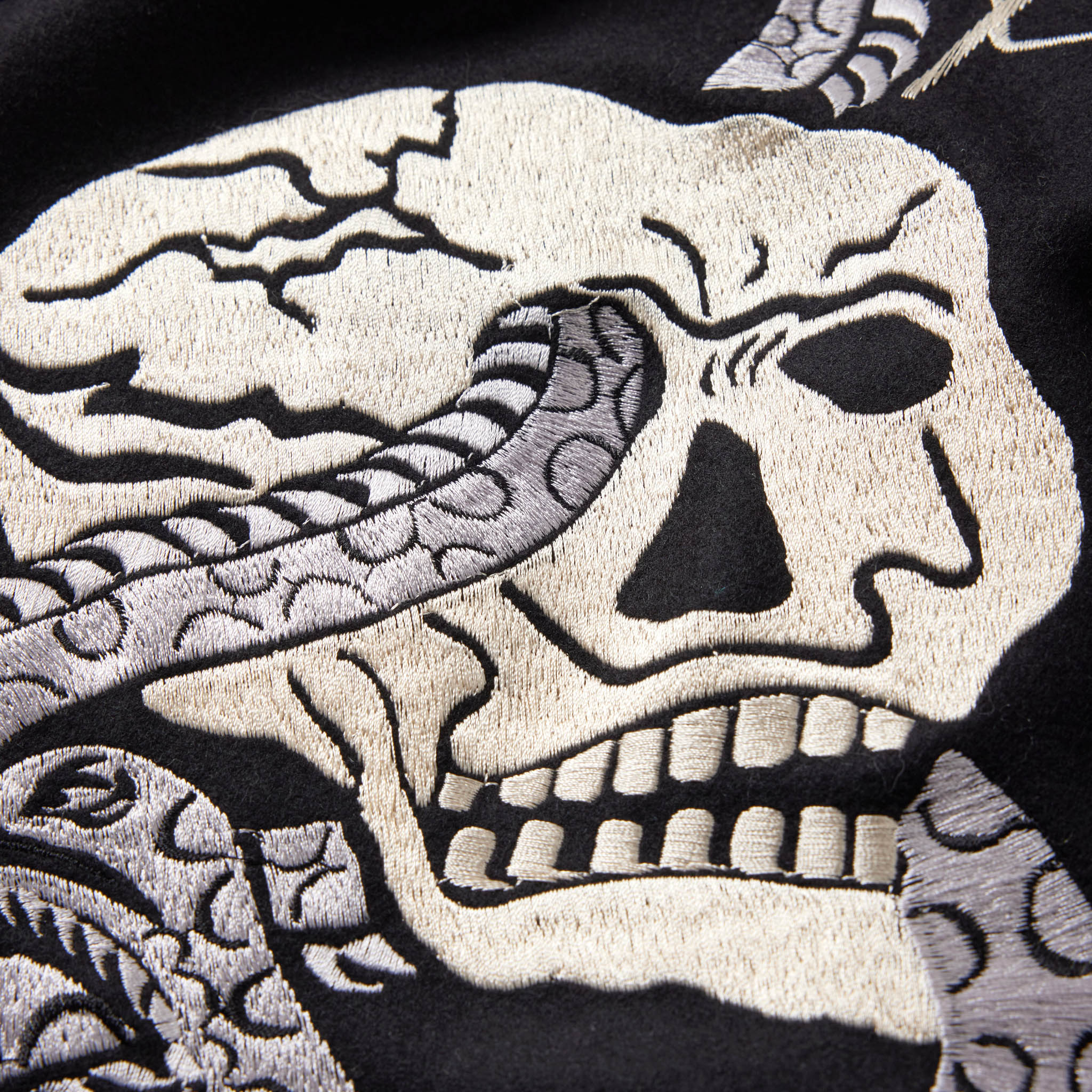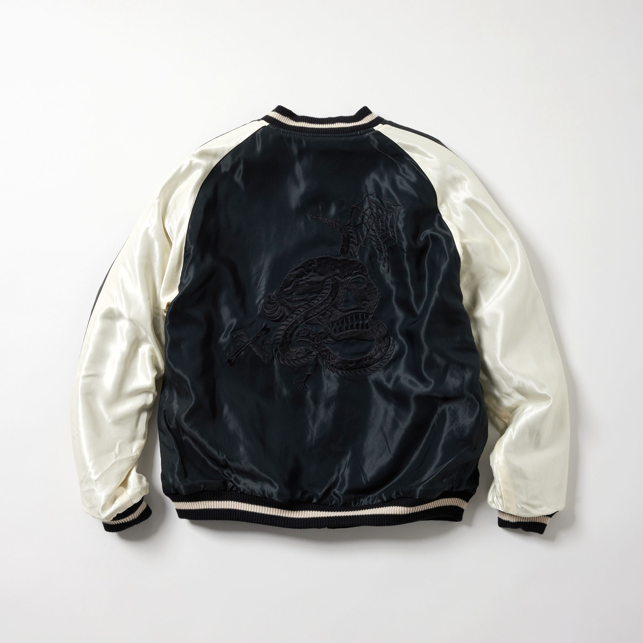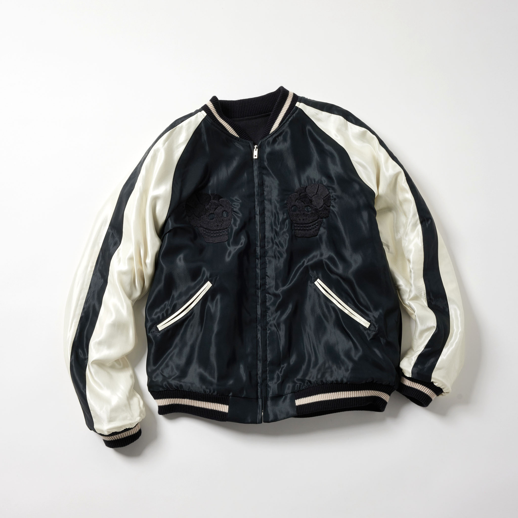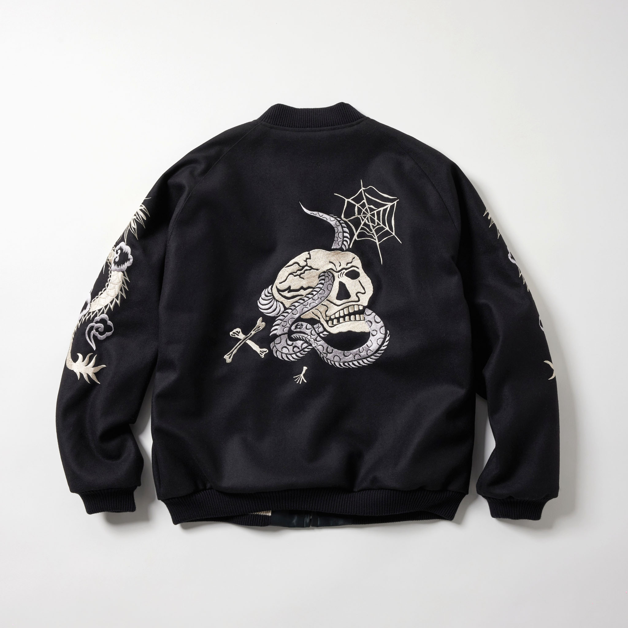 1950年代に実在したウール素材のスーベニアジャケット。様々なヴィンテージスカジャンの中から、現存する数が極めて少なく、希少価値の高いスカル柄を再現した一着で、胸の刺繍はブランド名とJAPANの文字にアレンジ。両面とも同じスカル柄だが、刺繍の色糸や生地の違いにより異なる雰囲気を楽しめる仕様になっている。