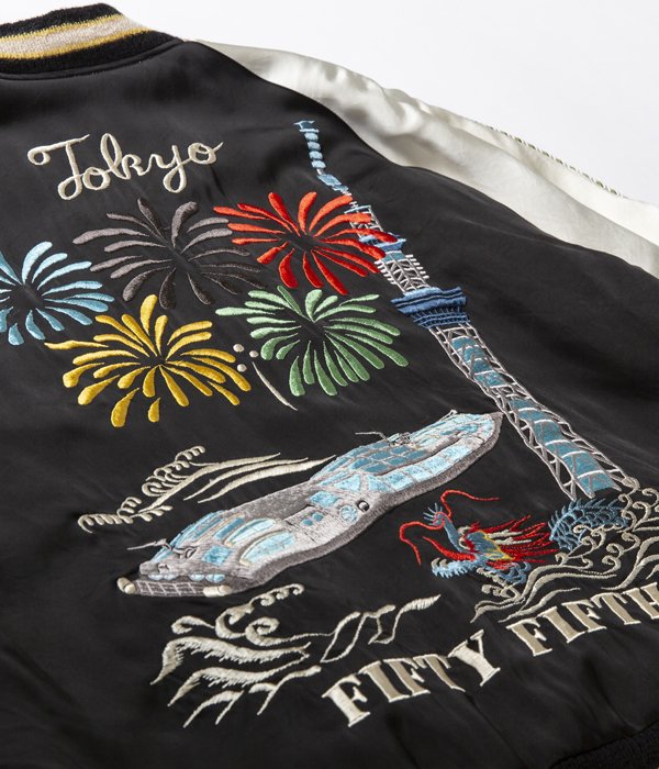 2020年で創業55周年を迎える東洋エンタープライズのアニバーサリーモデル。表面は2020年の東京の夏景色がテーマ。隅田川には近未来的なデザインの船が浮かび、高さ634メートルを誇る東京のシンボル、スカイツリーがそびえ立つ。夜空を想わせるブラックのアセテート生地に夏の風物詩である花火が5色の刺繍で咲き乱れた、美しい一着に仕上がっている。