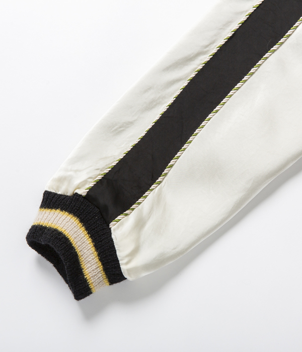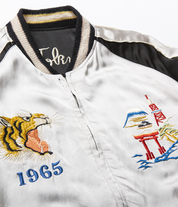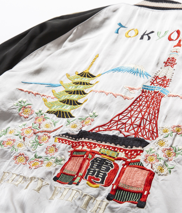 リバーシブル面は東洋エンタープライズが創業した1965年の東京がテーマ。浅草の雷門や天高く立ち上る東京タワーが色鮮やかな刺繍糸を駆使して描かれ、ボディに使われているシルバーのアセテート生地とのコントラストが際立っている。絵柄の下部には55周年を記念する「FIFTY FIFTH」の文字が両面ともに刺繍された、まさにスペシャルなスカジャン(スーベニアジャケット)。