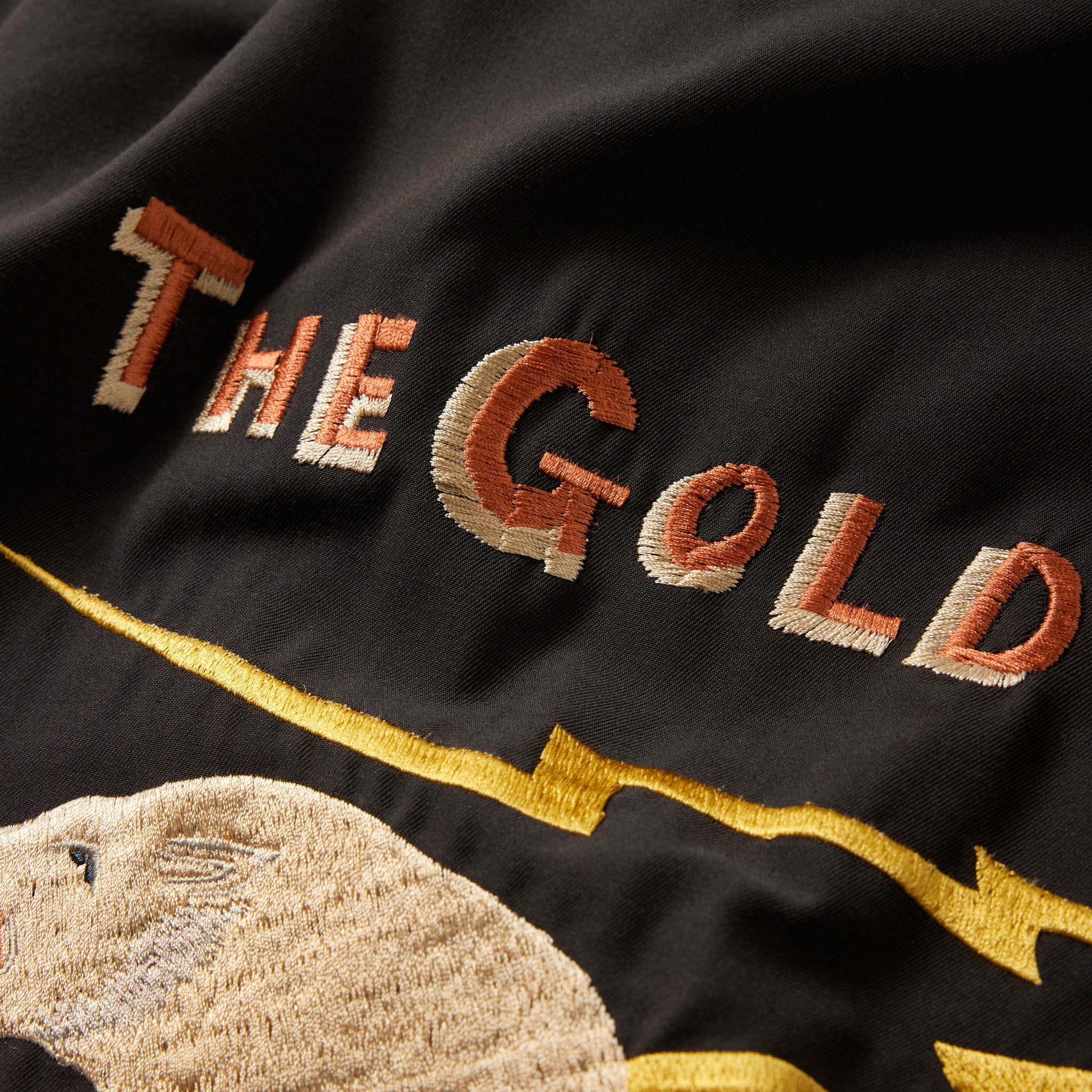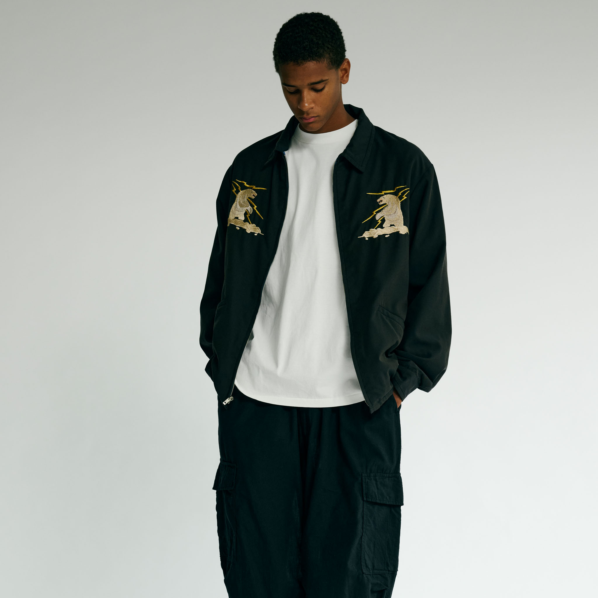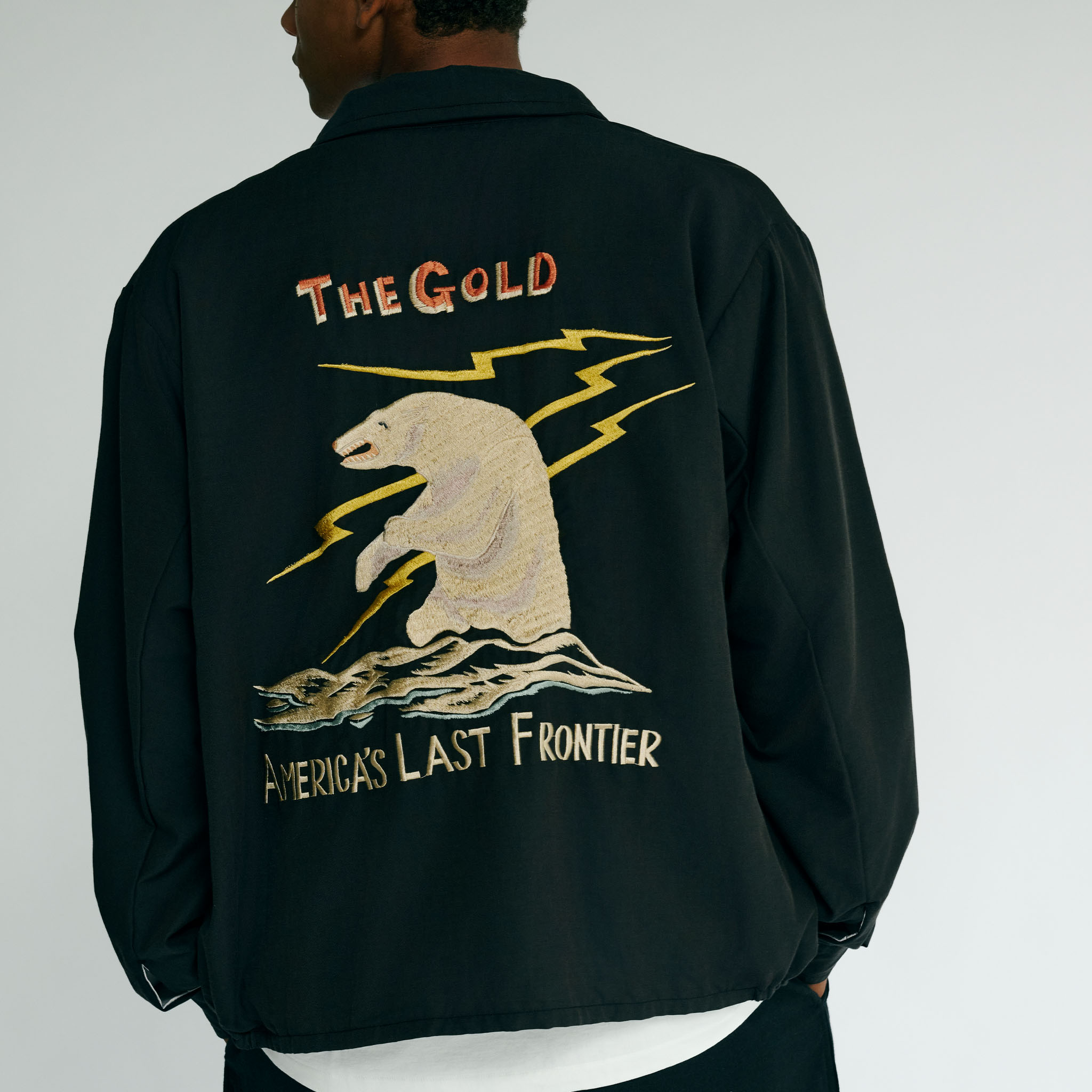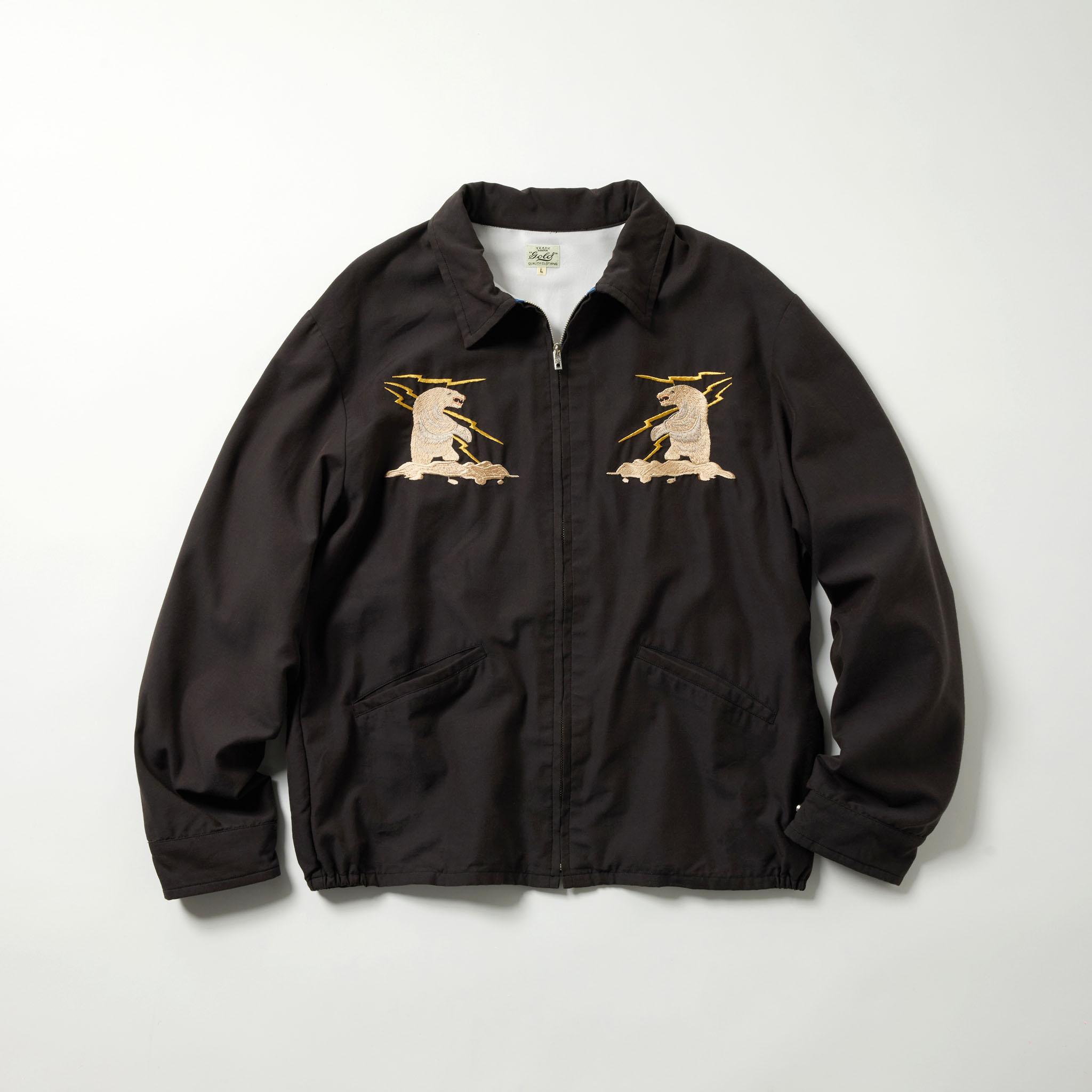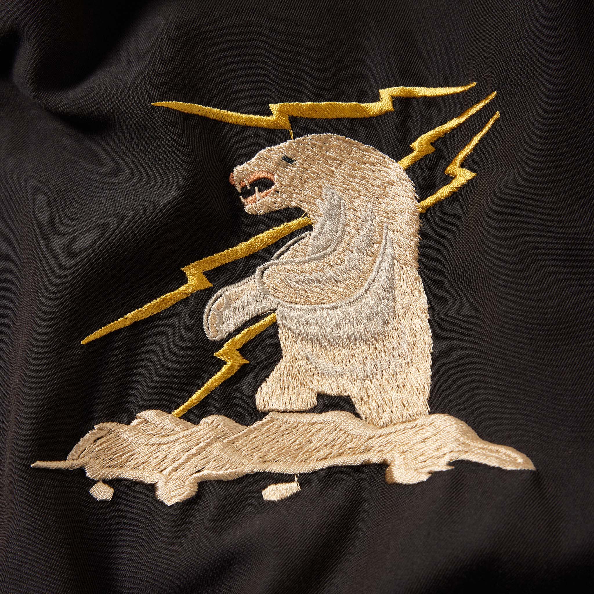 ベトナムジャケットの型をベースとし、人気の高い「稲妻と白熊」の刺繍を施した一着。レーヨン混のコットンツイルにエイジング加工を加えているため、しなやかな生地感やドレープ感が特徴。満遍なく褪色した生地と刺繍糸が、ヴィンテージさながらの風合いを醸し出している。