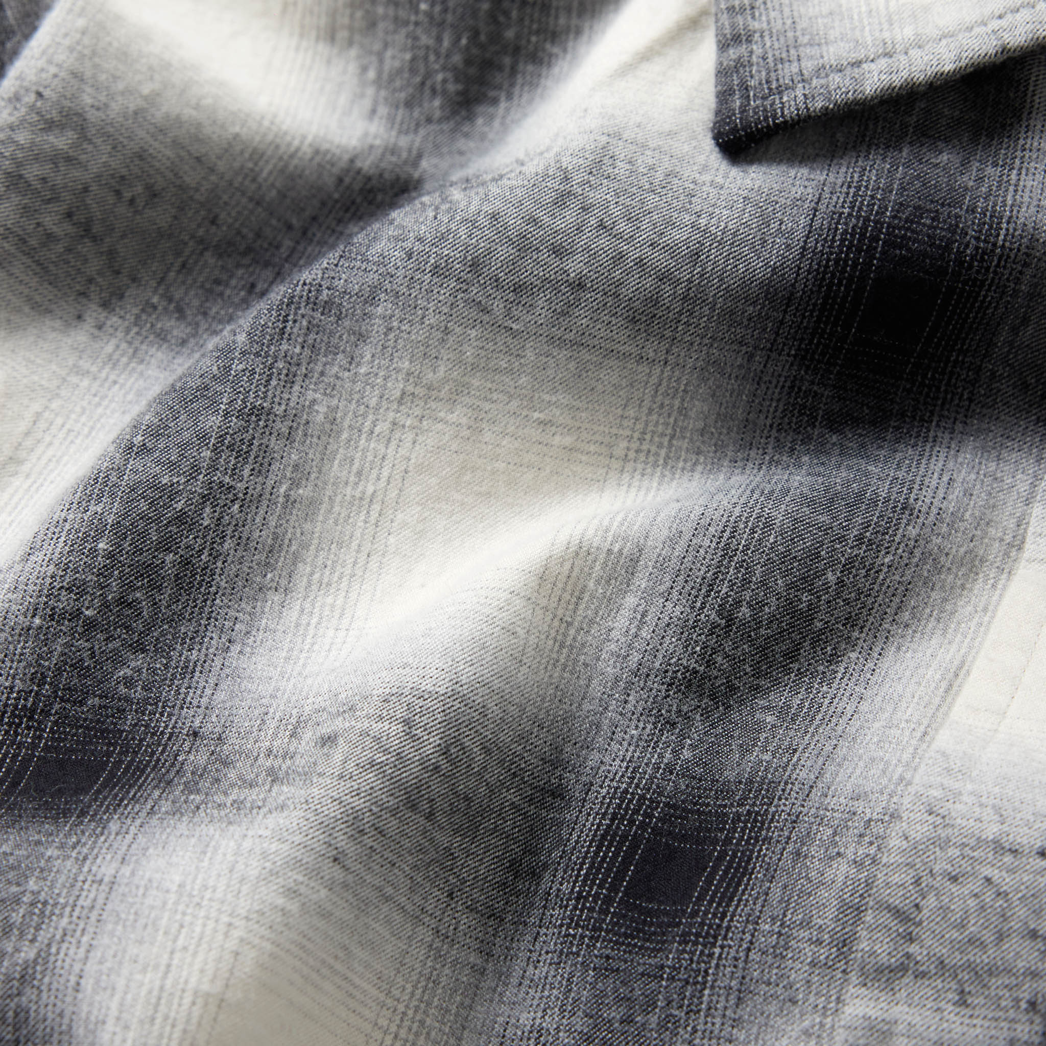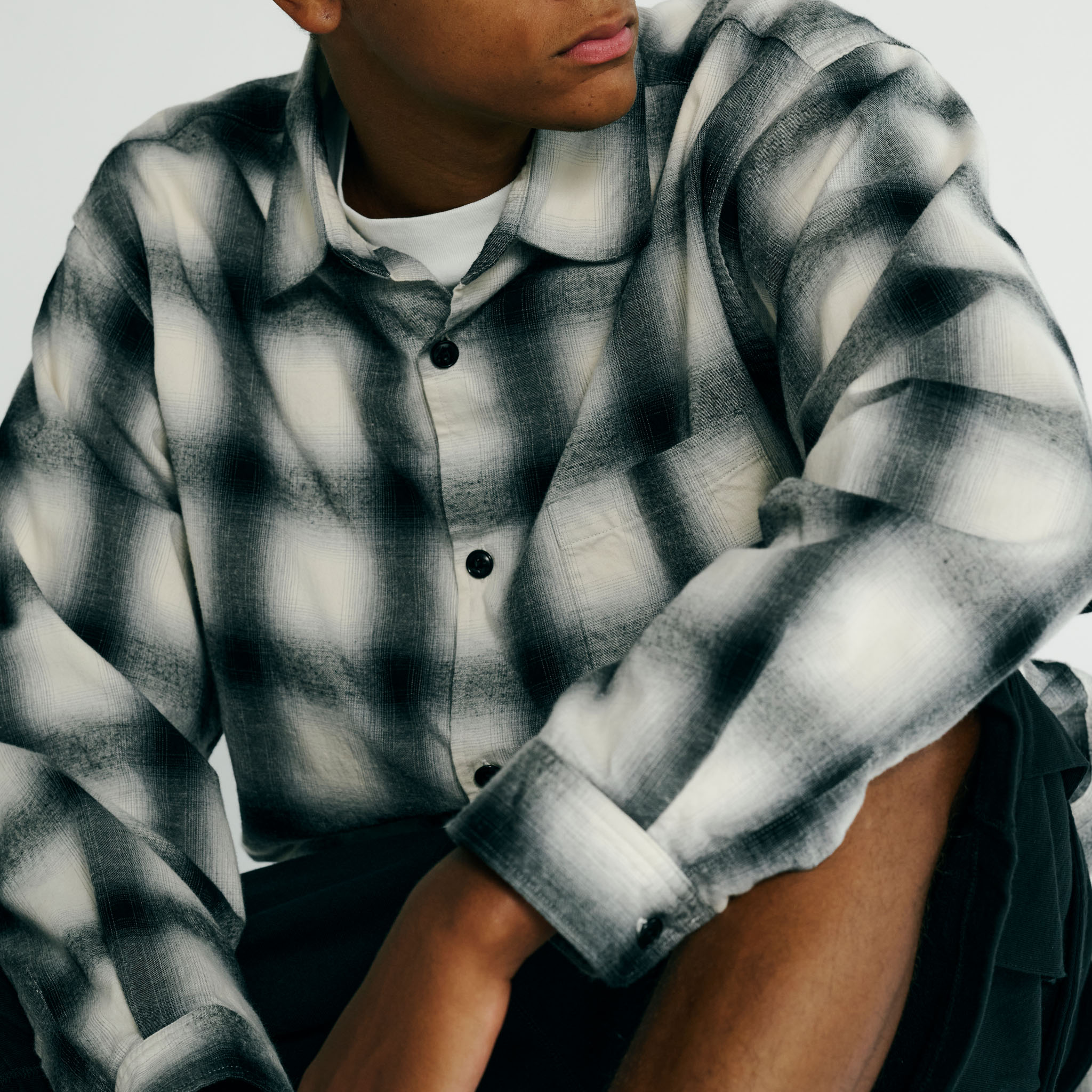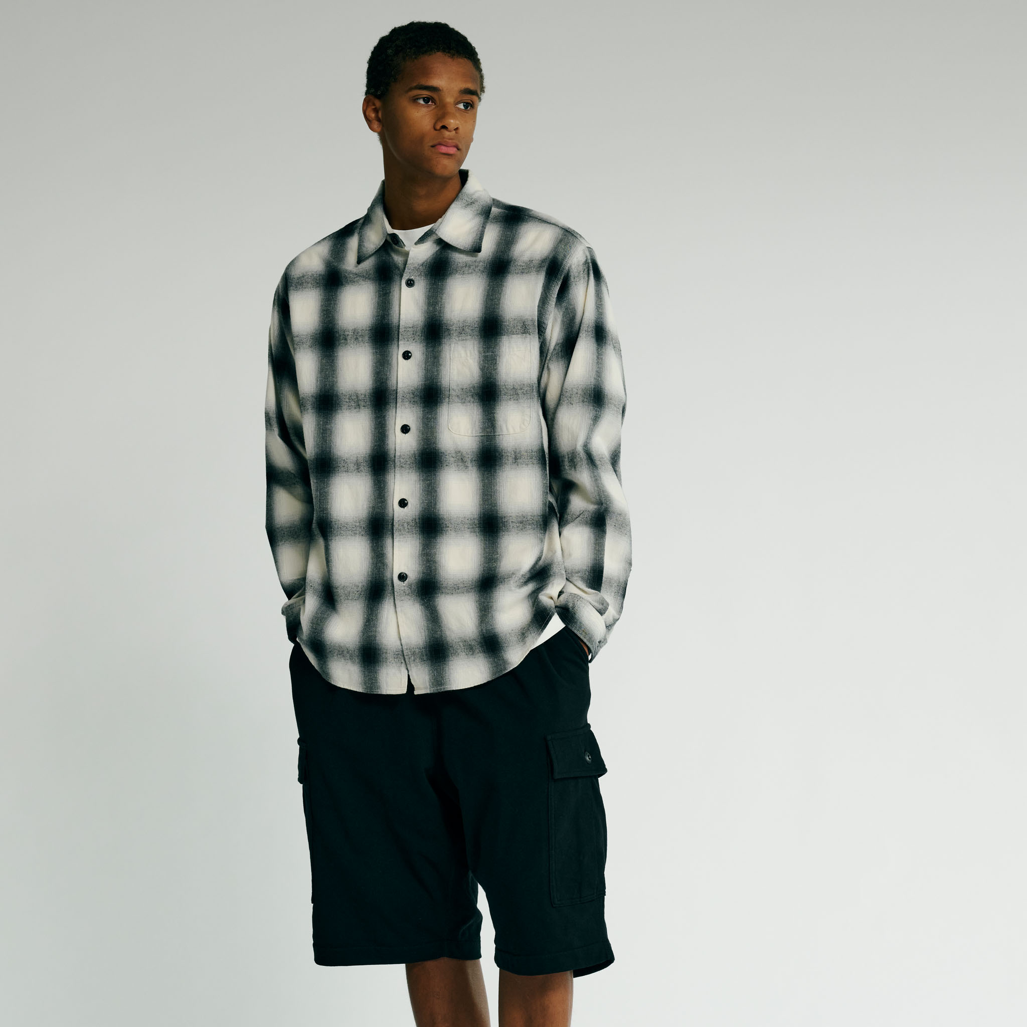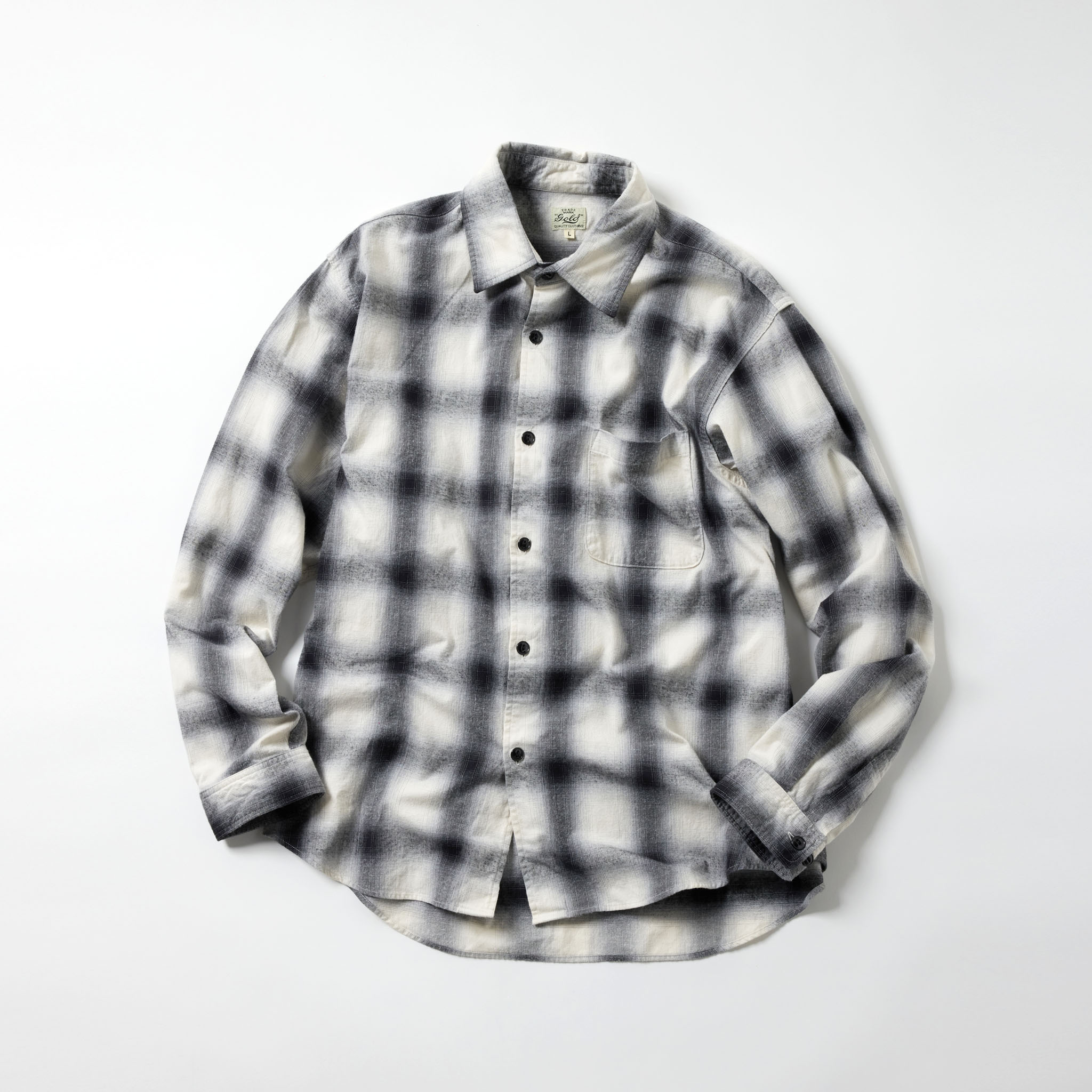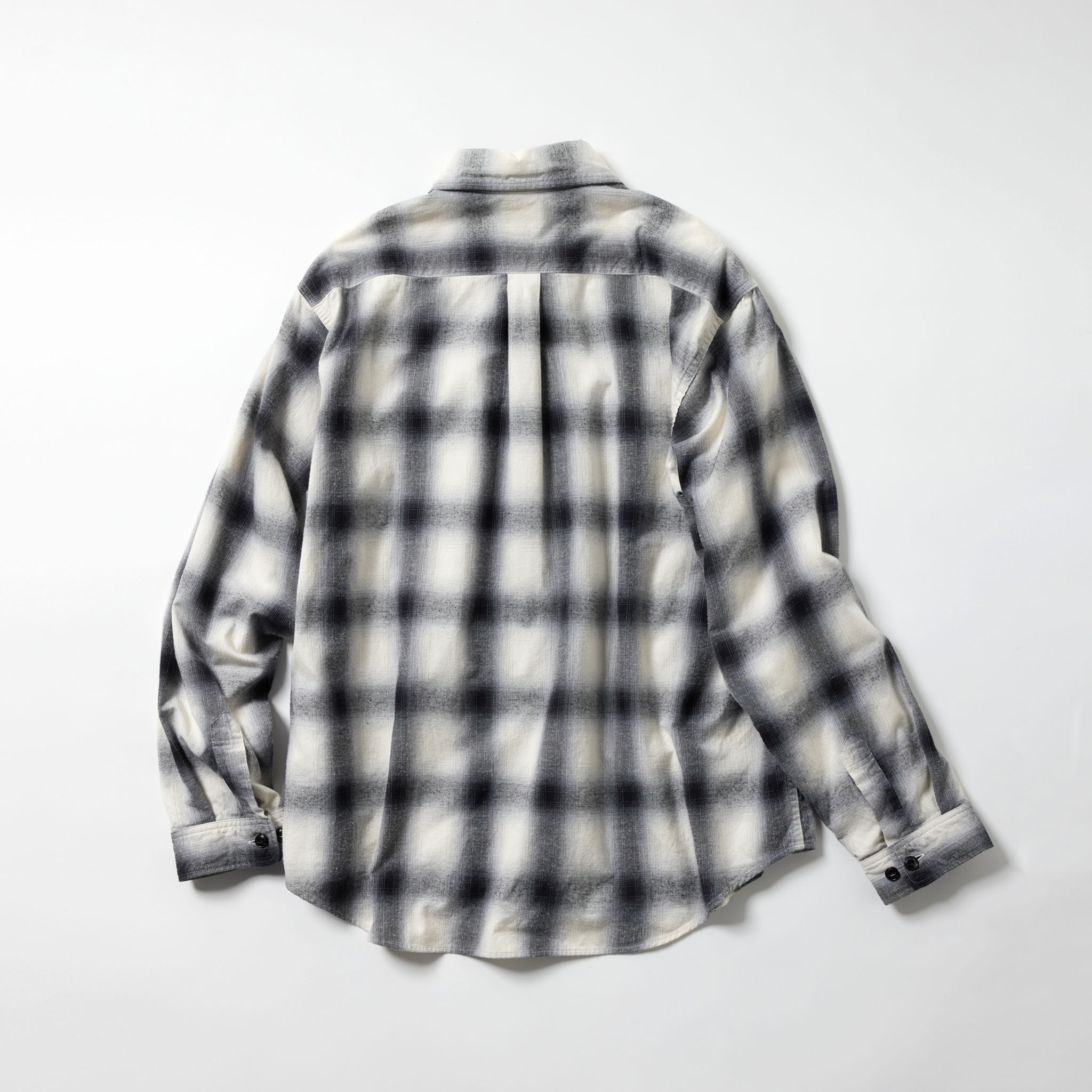 オリジナルで織り上げた先染めオンブレチェックを使用したレギュラーシャツ。アームホールをやや広めに設定し、ゆったりとしたシルエットにすることで、着用の際のストレスがない着心地となっている。袖カフスにボタンを2つ付ける事により、袖口が調整可能なディテールを採用。