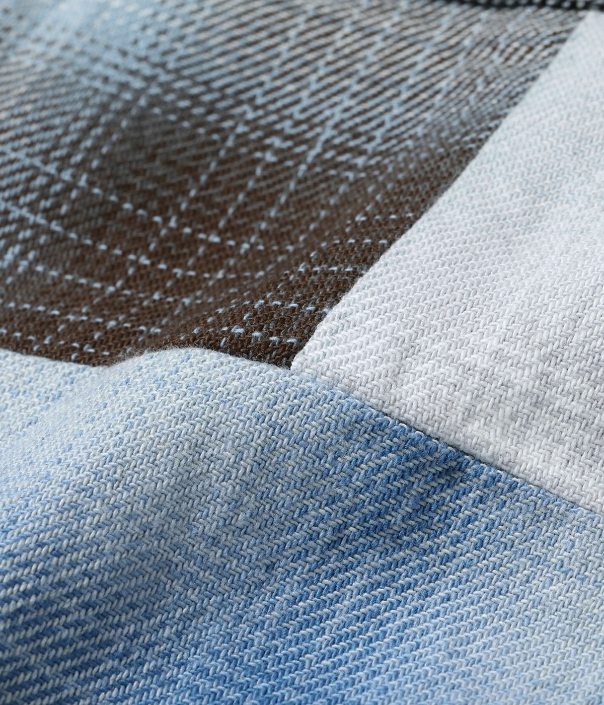 大胆にも前身頃に切り替えを施したワークシャツは、10番単糸のインディゴのトップ糸を掛け合わせた先染めのオンブレチェック生地を使用したアイテム。4色ともインディゴを使用した素材のため、さまざまな経年変化を楽しめる。肩幅や身幅を広めに設定したルーズシルエットのワークシャツは、Add Human Labor定番のシルエット。