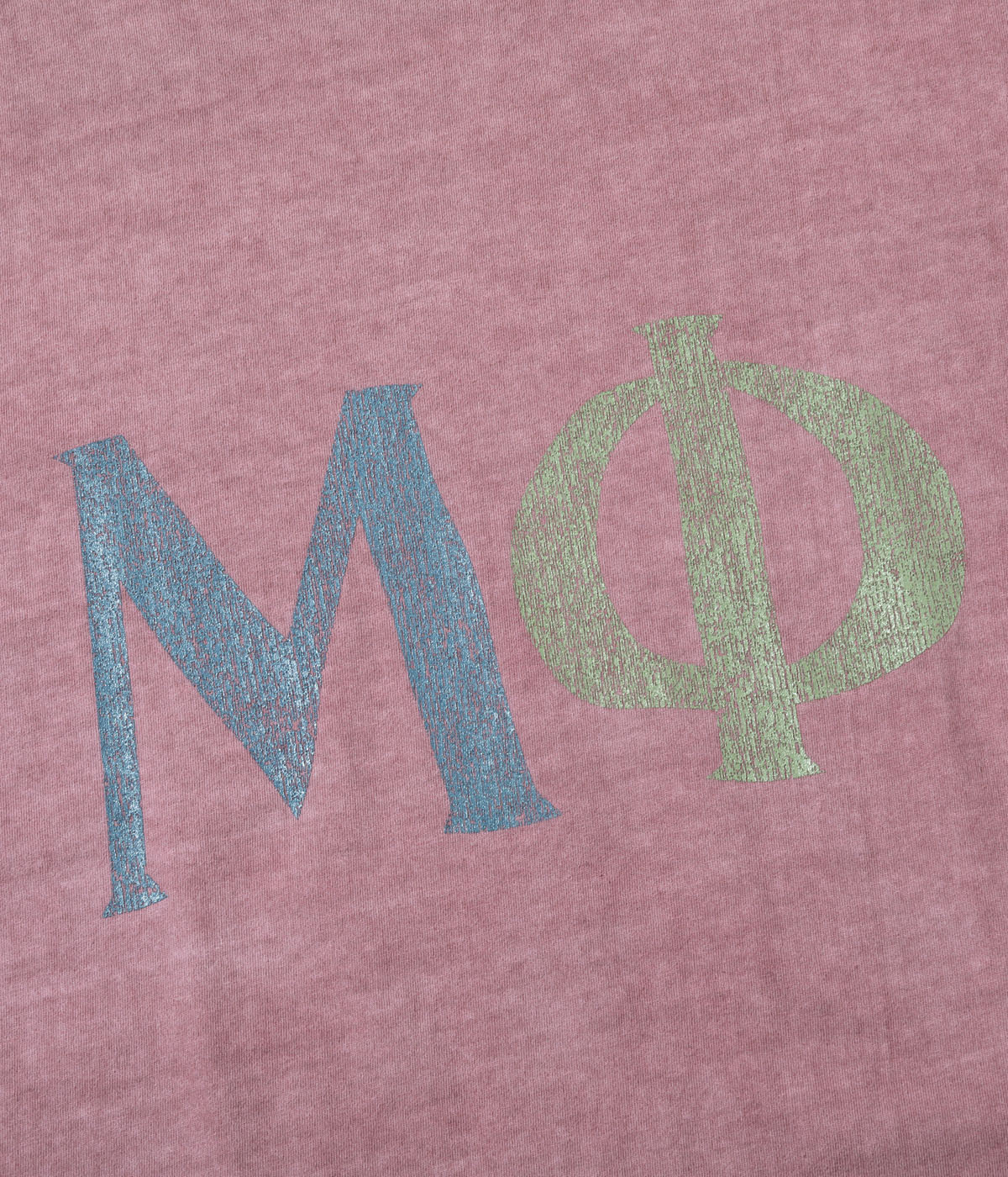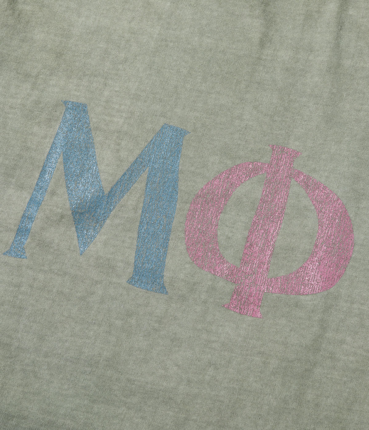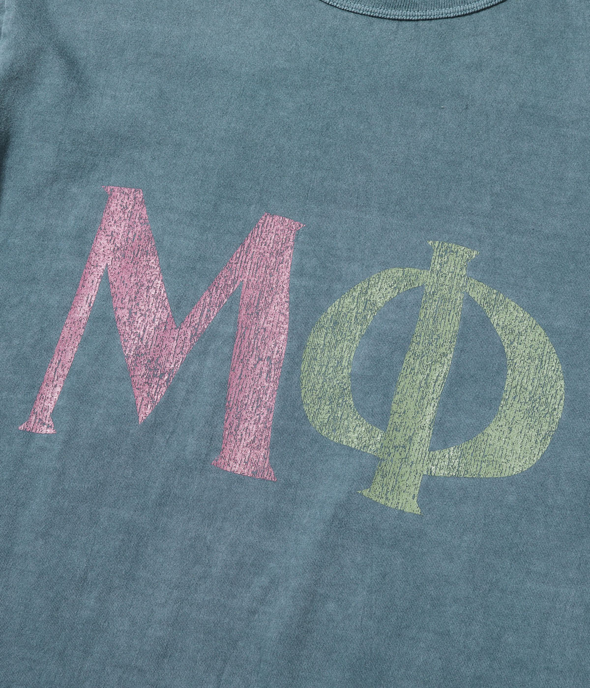 MADE IN USAのボディに、カレッジ系の古着に見られるギリシャ文字の「Μ(ミュー)」と「Φ(ファイ)」をMODUCTの「M」と「O」に見立ててデザインした一枚。「ΜΦ」の文字は版の時点でひび割れをデザインしたラバープリントとなっており、ピグメント加工したボディにプリントすることで、着用により古着のような経年変化が楽しめる。