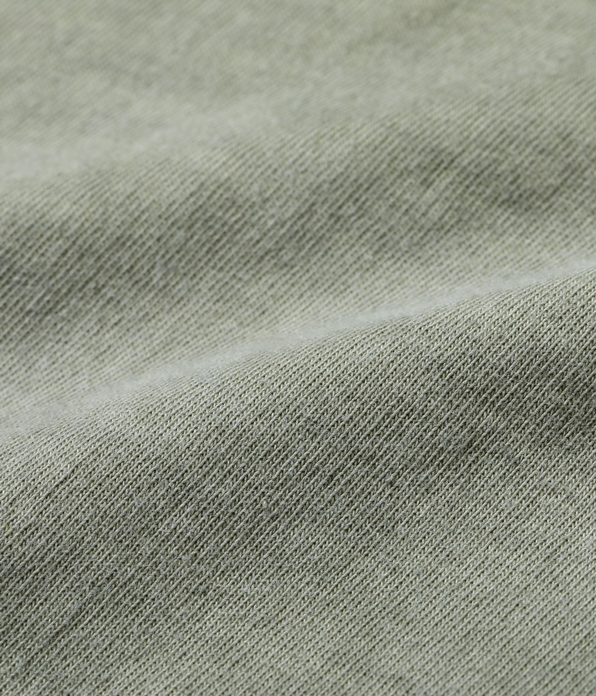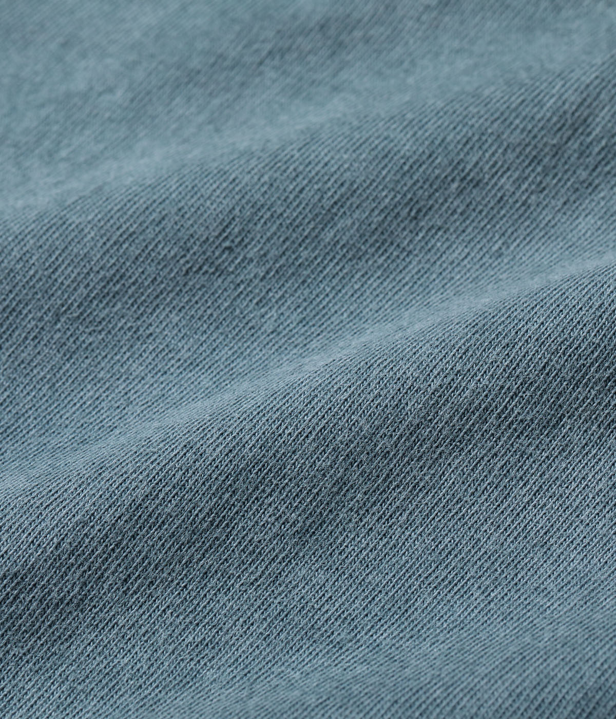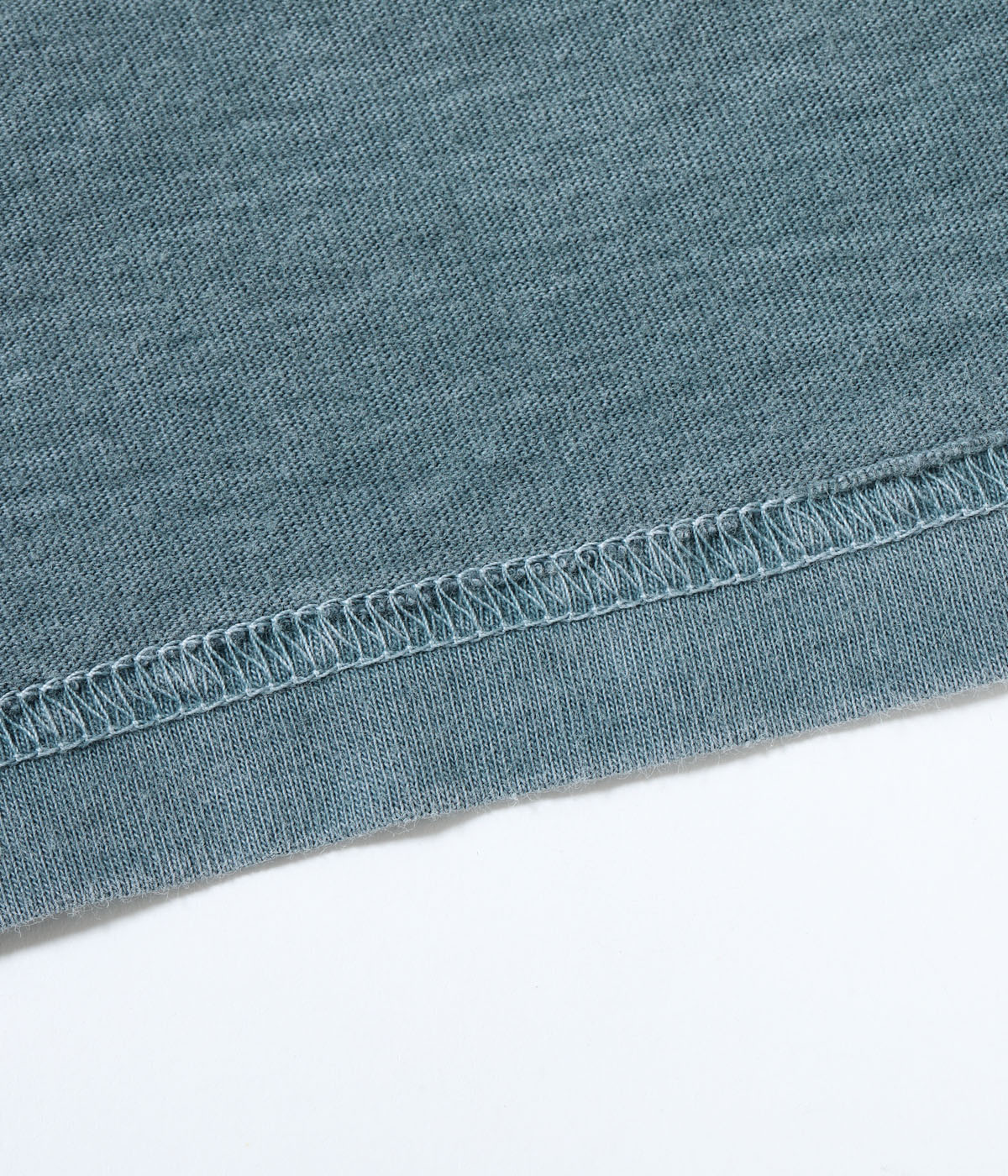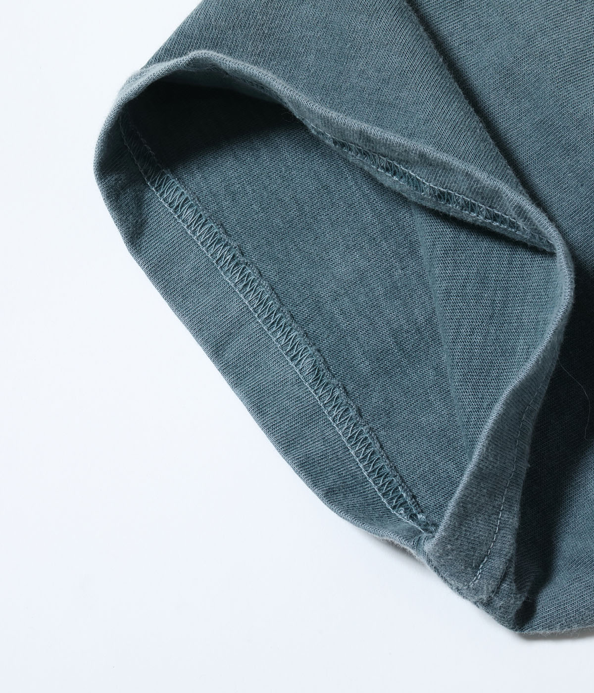 MADE IN USAのボディに、カレッジ系の古着に見られるギリシャ文字の「Μ(ミュー)」と「Φ(ファイ)」をMODUCTの「M」と「O」に見立ててデザインした一枚。「ΜΦ」の文字は版の時点でひび割れをデザインしたラバープリントとなっており、ピグメント加工したボディにプリントすることで、着用により古着のような経年変化が楽しめる。