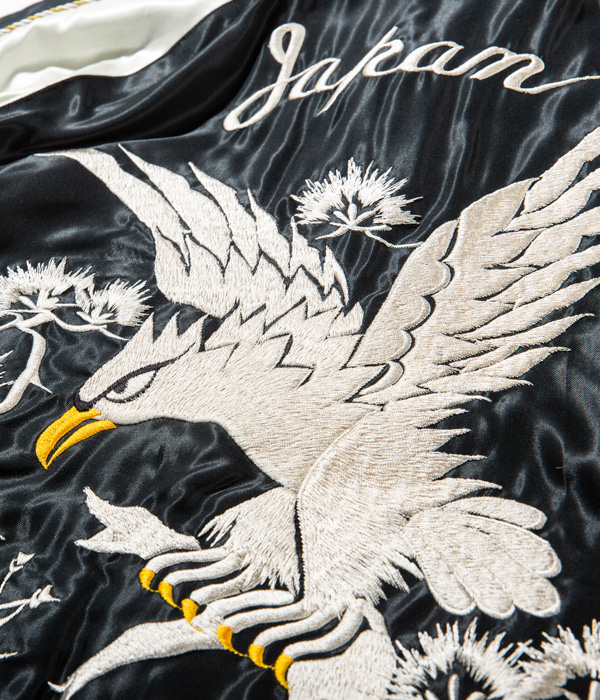 ブラックのボディに白鷲が映える1950年代中期の作品。オフホワイトの色糸を駆使し、針足の方向を複雑に変化させることで翼の躍動感や桜の立体感を表現している。リバーシブル面は白龍と赤龍が睨み合う構図。龍の絵柄は雲間に隠れたものが多く、全身が描かれたものは珍しい。