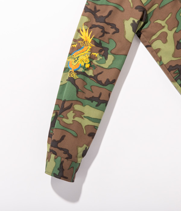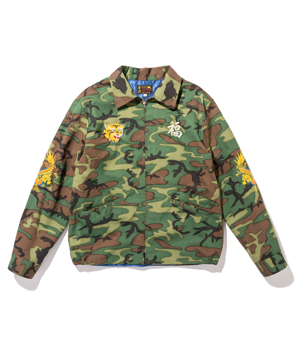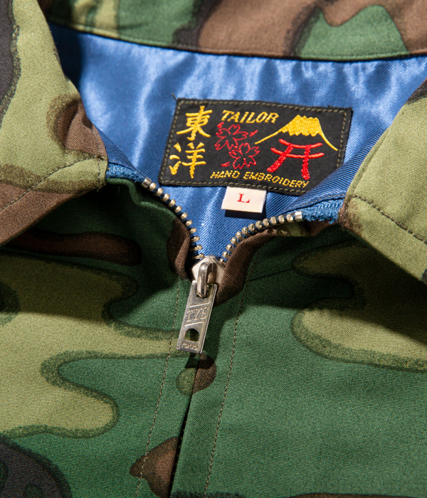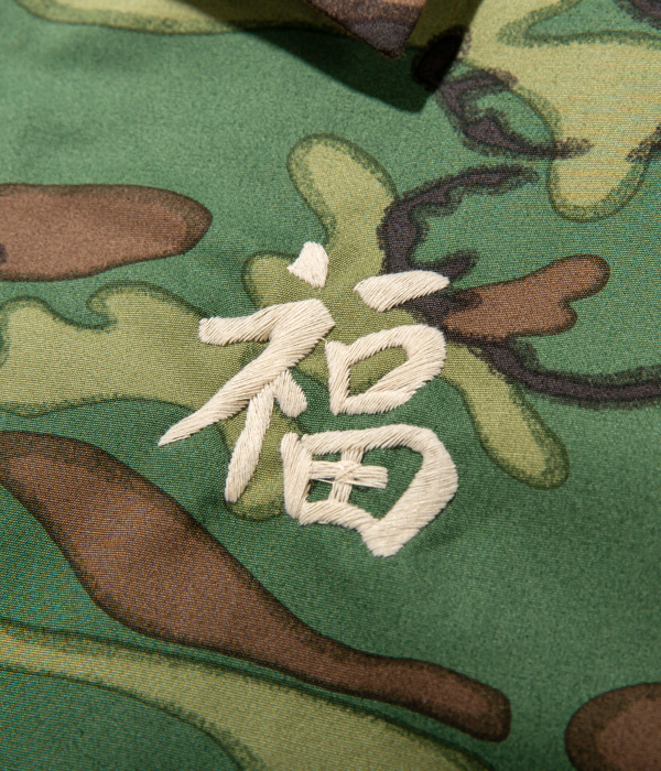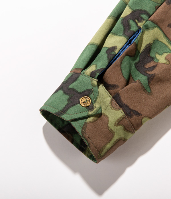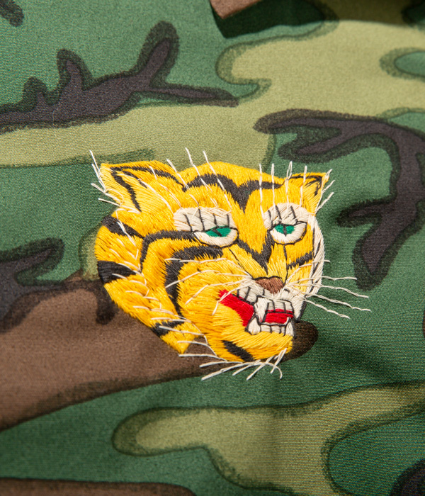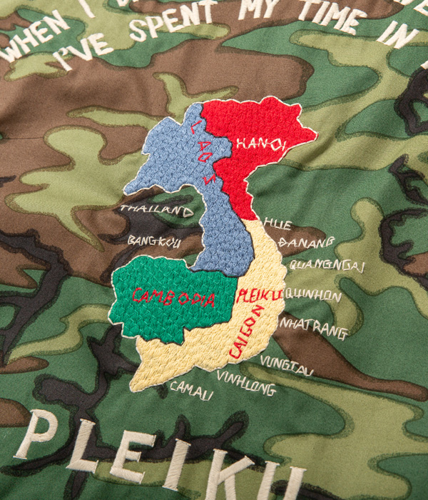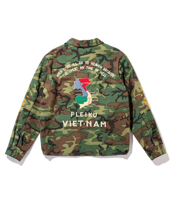 ヴィンテージでも珍しいウッドランドカモフラージュ生地のベトジャン。1960年代中期にベトナムの都市プレイクに駐留していた米兵がオーダーしたもの。裏地はブルーのアセテート生地。刺繍は定番のスタイルで、胸には虎と「福」の文字、背中にはベトナムの地図が描かれている。