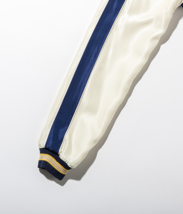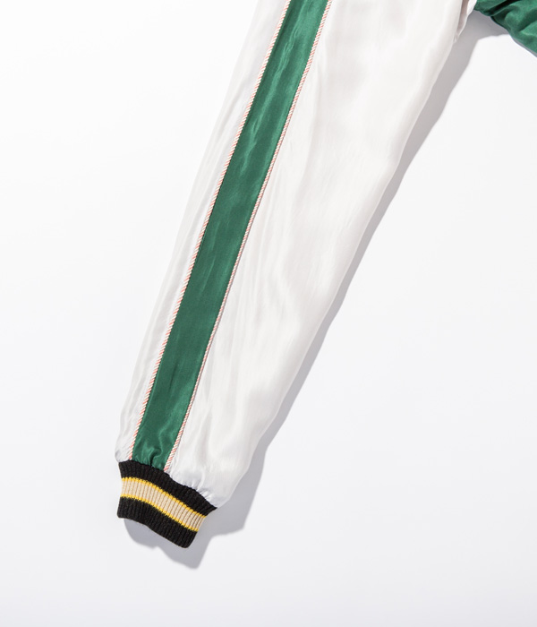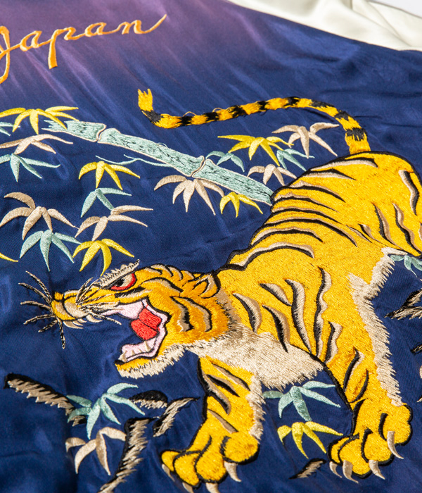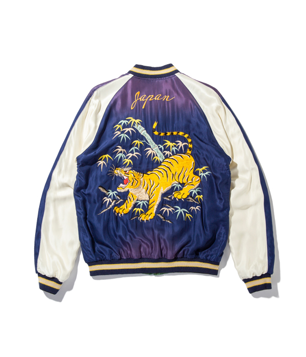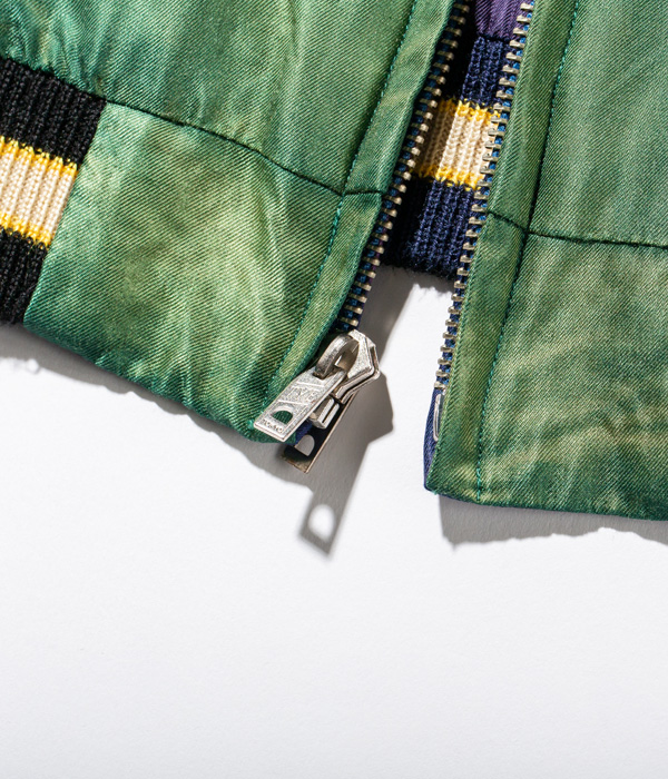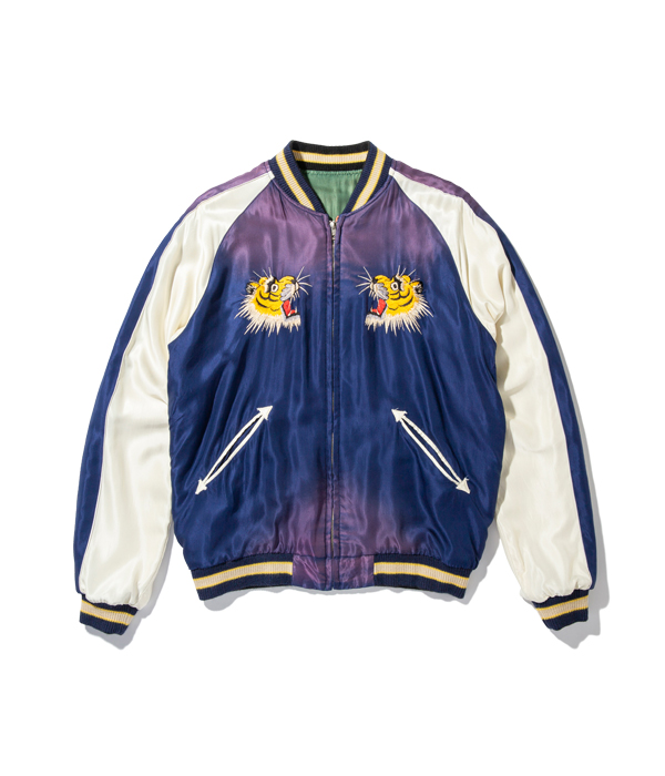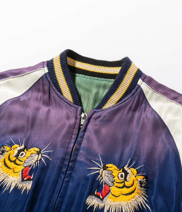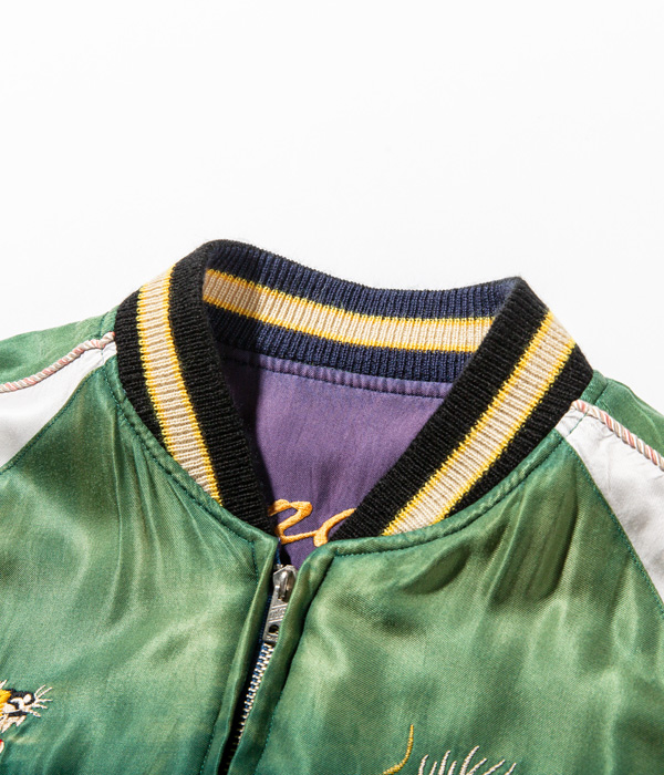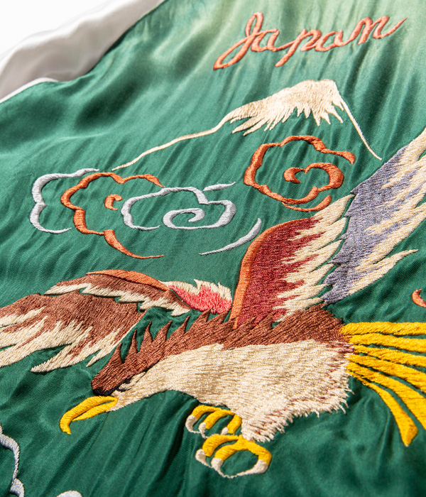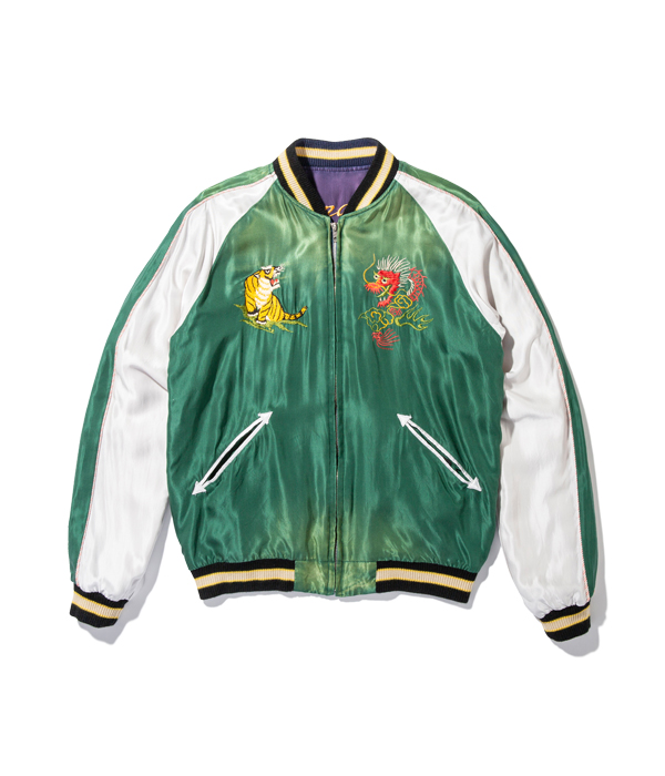 スカジャンの三大モチーフである鷲・虎・龍を網羅した1950年代前期の作品。リバーシブル面は笹と虎の王道の組み合わせ。色褪せたグリーンとネイビーのアセテートに鮮やかな色糸の刺繍が映える。またエイジング加工は袖の縄のパイピングにもおよび、リアルな褪色を見せている。