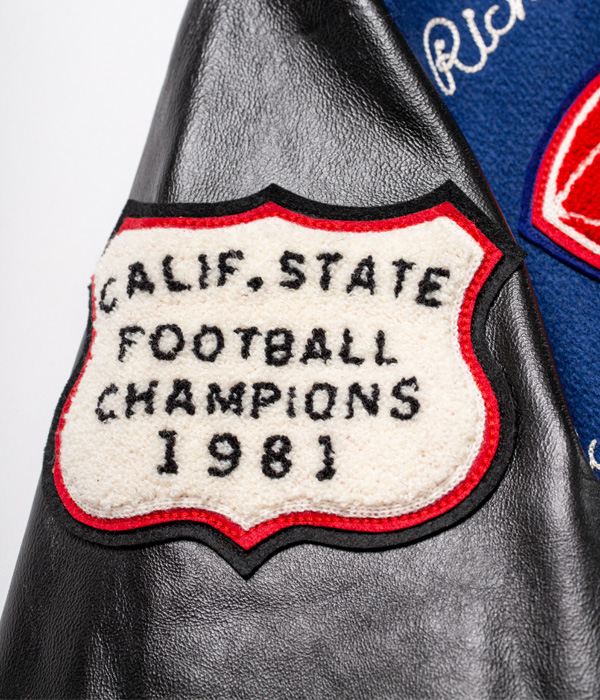 身頃だけでなく右袖には1981年にカリフォルニア州の大会での優勝を記念したシニールが縫い付けられており、これは上位の成績を収めるごとに装飾を増やしていったアワードジャケットならではの特徴。深みのあるロイヤルブルーのボディにレッドのシニールが目を引く一着。