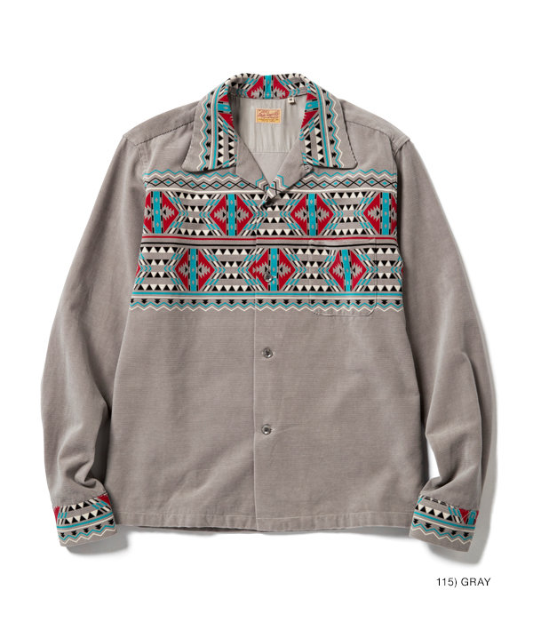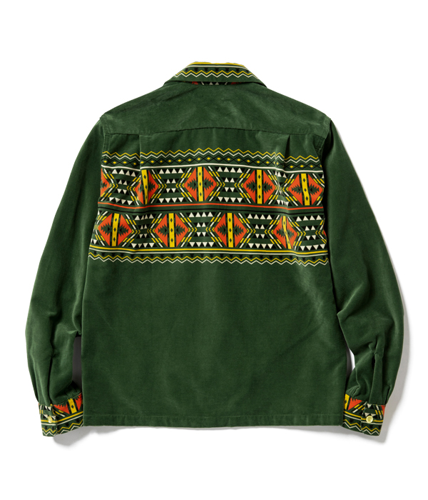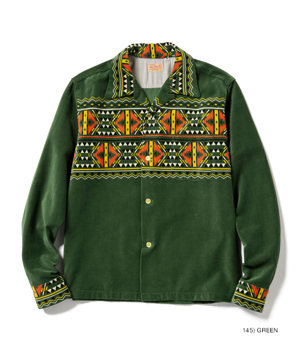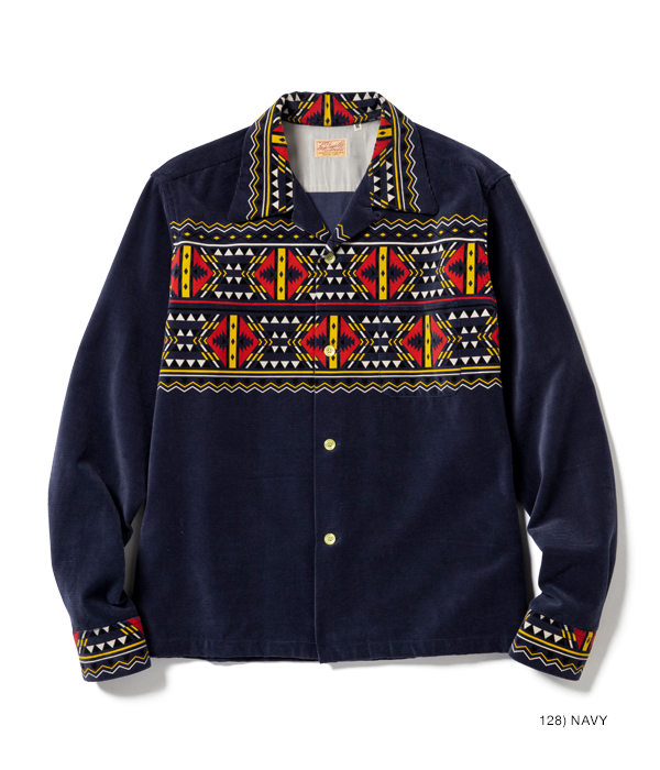 1950年代のヴィンテージシャツにみられる幾何学模様を組み合わせたテキスタイルデザイン。それらにはネイティブアメリカン調のデザインも多いが、なかでもこの柄は特に珍しい逸品。胸や背だけでなく、襟やカフスにまで柄を配した贅沢な裁断パターンのヴィンテージをもとに、柄出しまで忠実に再現している。