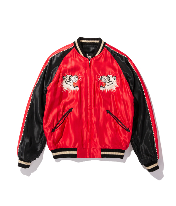 虎の顔のみを細部まで描写したタイガーヘッドと呼ばれる刺繍が特徴的な1950年代中期のスーベニアジャケット(スカジャン)。真紅のアセテートを使うことで咆哮する白虎を強調し、ブラックの袖とリブで全体を引き締めている。