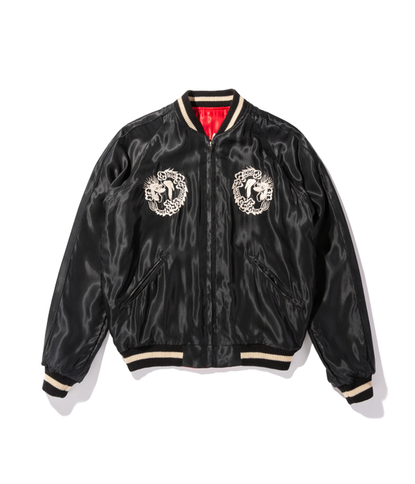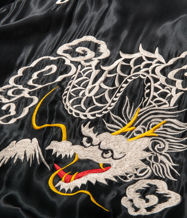リバーシブル面は黒一色のボディに白龍が舞う図案。両面とも白を基調とした刺繍だが、全く異なる仕上がりに。筆記体のJAPANの文字が小さめで龍の絵柄も下部に比重があるが、ヴィンテージに見られるその絶妙なバランスまで忠実に再現している。