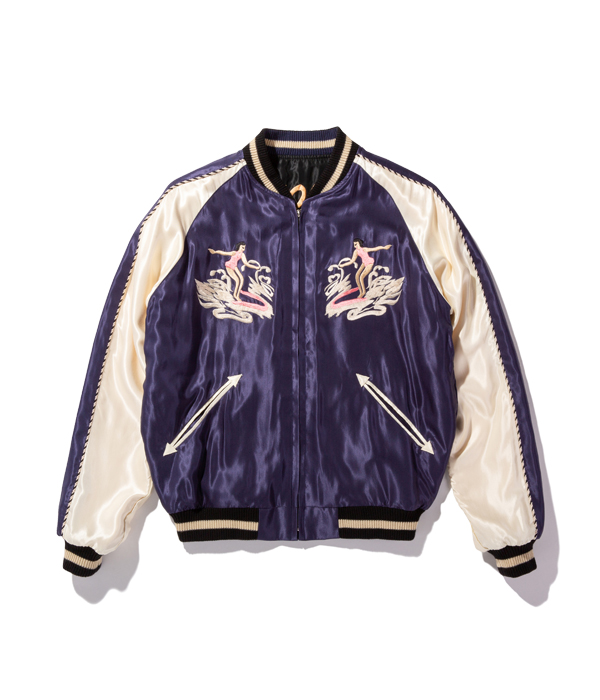ハワイをモチーフとしたヴィンテージでも珍しい作品。胸にサーファーガール、背中にはカメハメハ大王像を囲んで踊るフラガールたちが刺繍されている。リバーシブル面はハワイ航路の豪華客船のレストランメニューにも使われていたウクレレのデザイン。