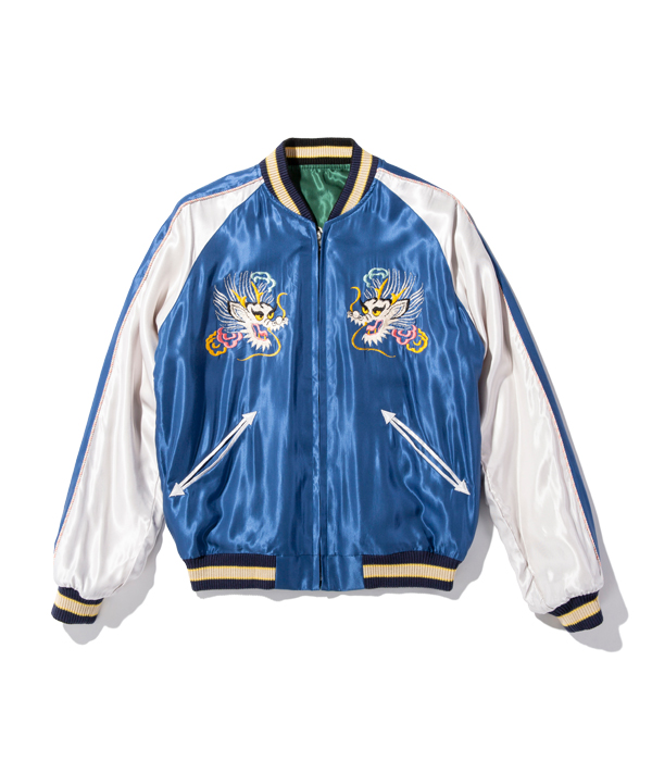 快晴を想わせるブルーのアセテート生地に金色の龍を描いた1950年代中期の作品。富士山が小さく見えるほどの巨躯を持ち、天を覆うかのように配された龍が特徴。また通常より大きく刺繍されたブロック体の「JAPAN」の文字も珍しい。