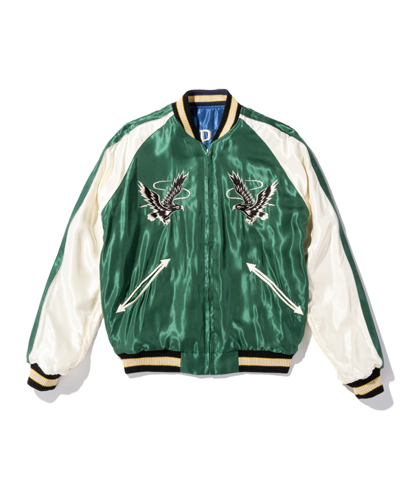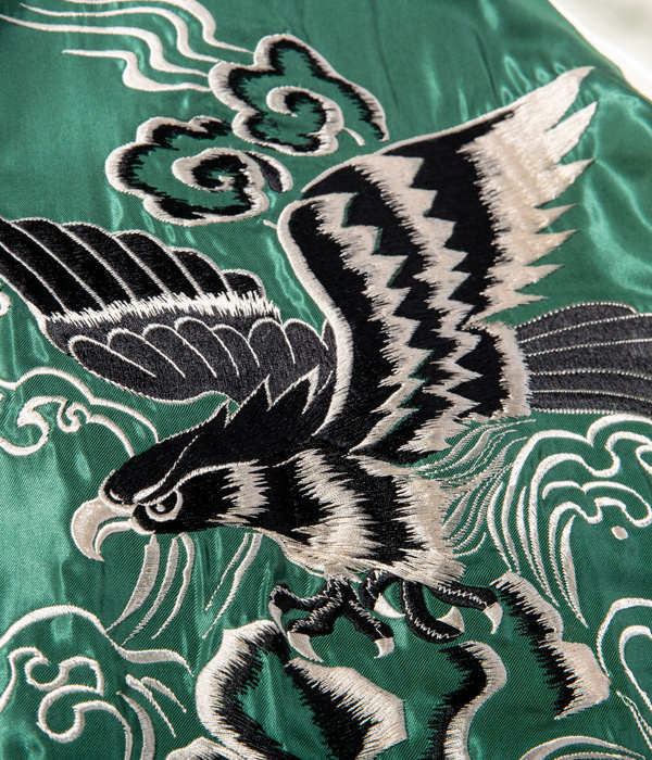 リバーシブル面は波飛沫のなかで翼を広げる鷲の絵柄。グリーンのアセテートに対し、刺繍はブラックとオフホワイトの色糸のみ。波は白の単色、他は2色の色糸を使い分け、メインモチーフである鷲を強調させた職人のセンスを感じる一着。
