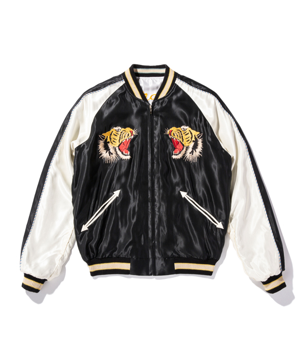 牙を剥き咆哮する虎を描いた1950年代中期の作品。スーベニアジャケット(スカジャン)における王道的な絵柄と配色ながら、虎斑(とらふ)のブラックとイエローをリブで拾い、スカジャン初心者だけでなく玄人まで納得させる仕上がりとなっている。