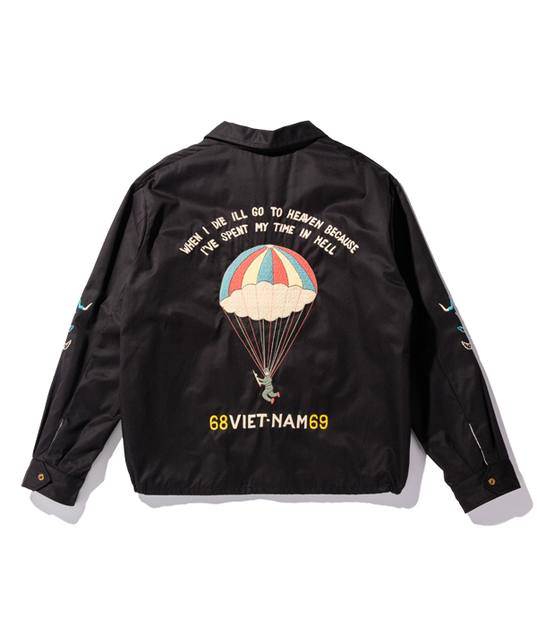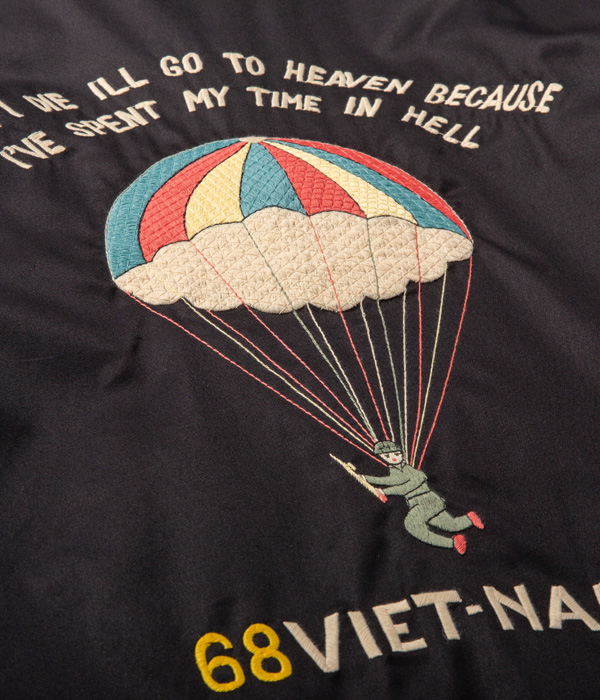 1968~1969年の間、ベトナムに駐留していた米兵が母国に持ち帰ったベトジャンを再現。こちらは定番のスタイルから外れ、袖だけでなく左胸にも龍、背中にパラシュートの刺繍が入った珍しい一着。パラシュート部隊に所属していた兵士のカスタムオーダー品と考えられる。ブラックだけでなくヴィンテージでも珍しいピンクの2配色。
