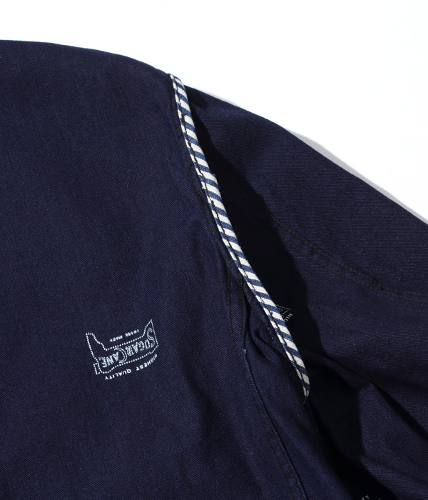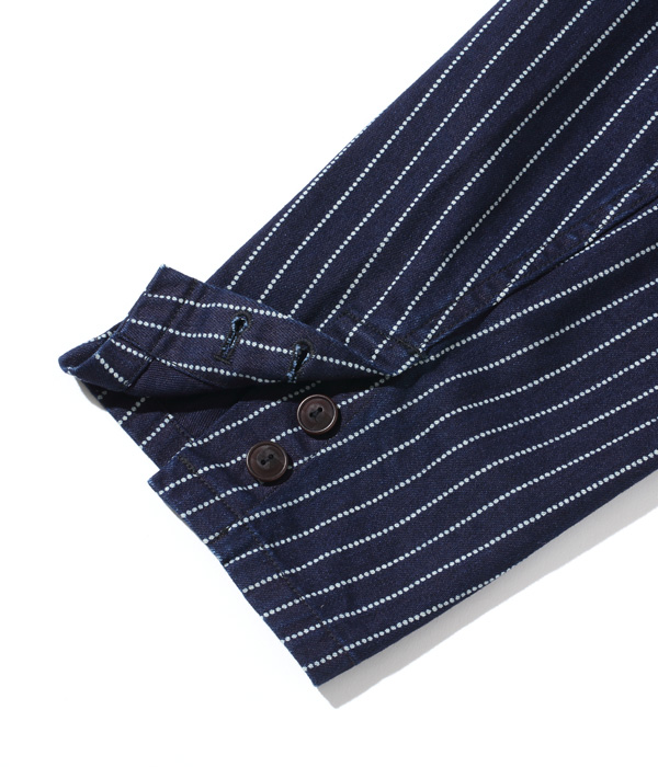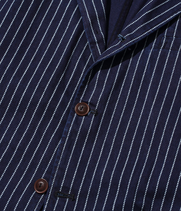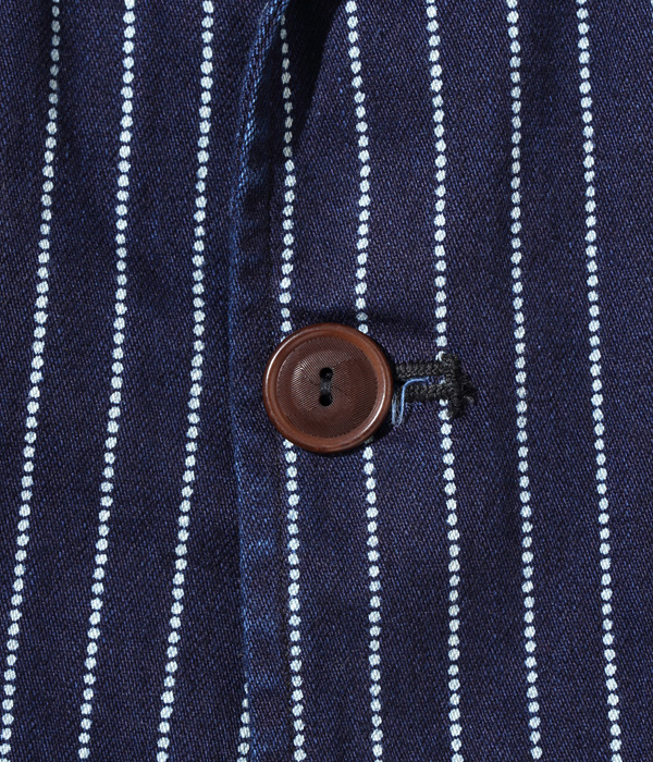 インディゴ糸で織り上げた生地に抜染(ばっせん)でドットストライプ柄を染め抜いた9オンスのウォバッシュストライプ生地のジャケット。同じ生地のトラウザー(Lot No. SC42203)とセットアップで着用可能。