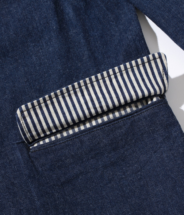 1/4インチ巾ステッチ、段返り3つボタンで中1つ掛け、後身頃はフックベントというアイビールック仕様。主要部分の縫製は2本針巻き縫いで、外側はオールブラックステッチの落ち着いた仕上がり。スーツとは異なり毛芯や肩パッドを使用していないので、リラックスして着用できる。ボタンは彫刻の入ったナットボタン。ポケットの袋地にはヒッコリー生地を使用しており、見え隠れする内側のストライプが程よいアクセントとなっている。