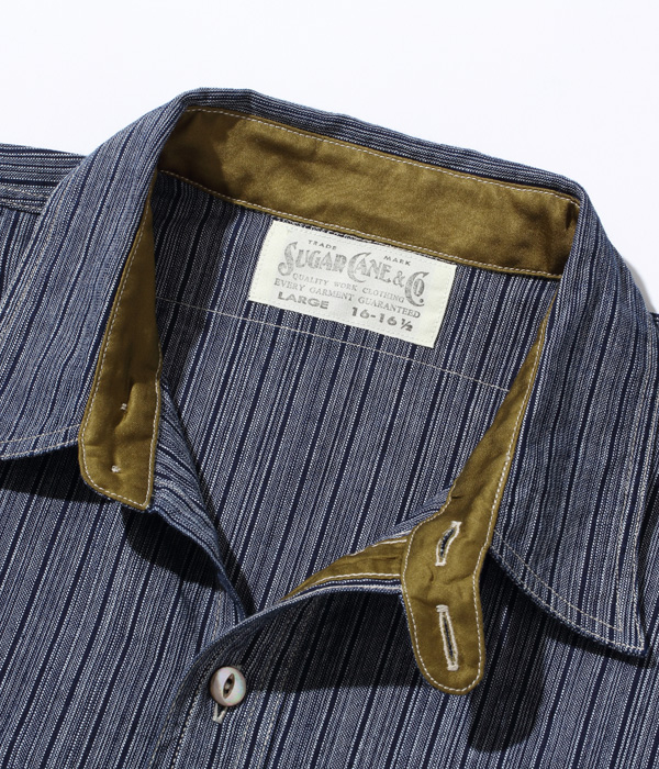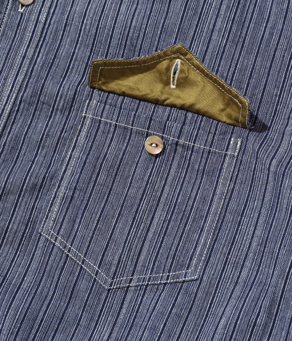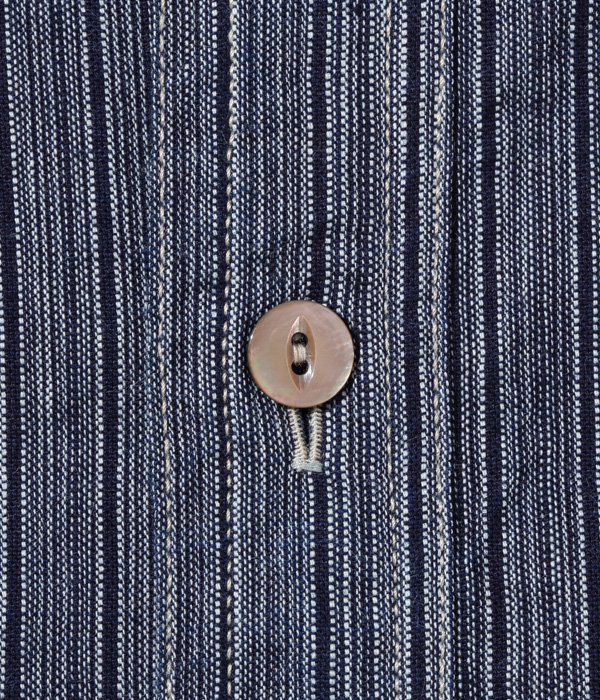 台襟の内側や前立ての裏、ポケットフラップの裏には補強用としてゴールドのサティーン生地が当てられ、デザインのアクセントとしても一役買っている。ボタンは茶蝶貝のキャッツアイ(猫目)ボタンを使用。コリーストライプ生地を使用。 定番のワークウエア素材をホワイト×ブラックの配色で作製し、3本針巻き縫い仕様のベーシックなワークシャツに仕上げた。