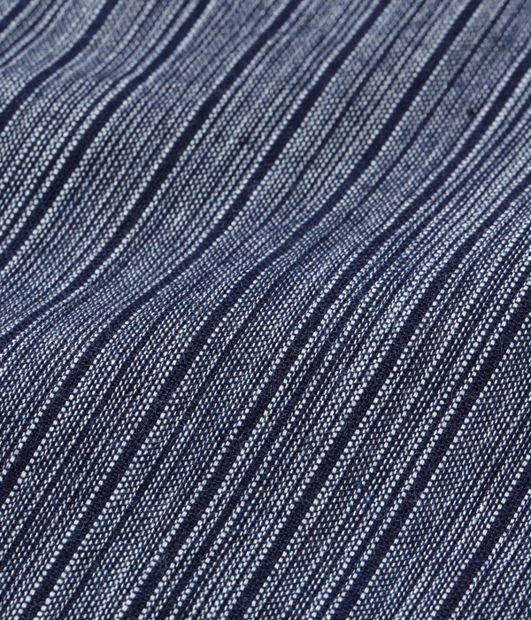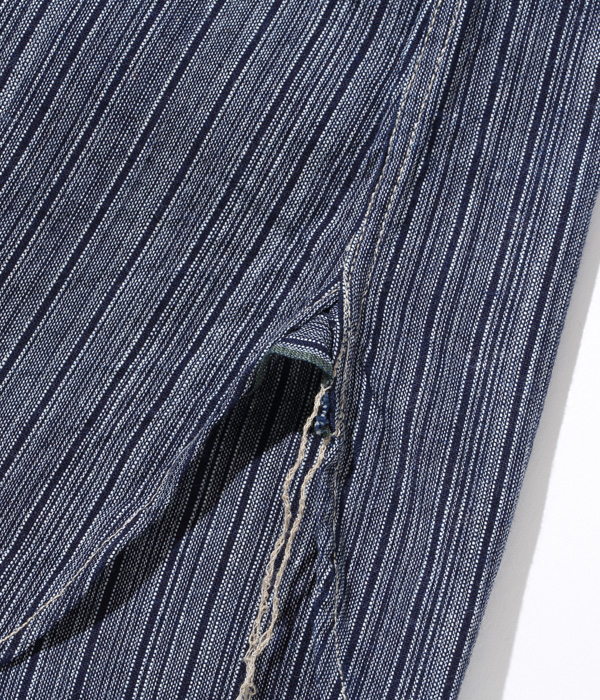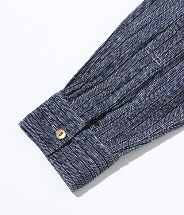 太番手の糸で織り上げたやや厚手のヒッ5オンスのインディゴストライプ生地で仕立てたワークシャツ。この生地はフレンチヴィンテージに使用されていた生地をベースに、シャトル織機を使って復刻を試みたもの。通常のストライプ生地であれば数インチごとに柄がリピートされるが、この生地に関しては細線部分が完全にランダムな幅で構成されており、最終的に44インチの生地幅すべての経糸を分析。試行錯誤の末、かなりの労力を要して復刻に成功した。