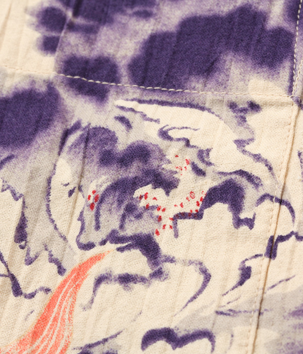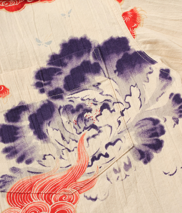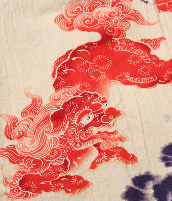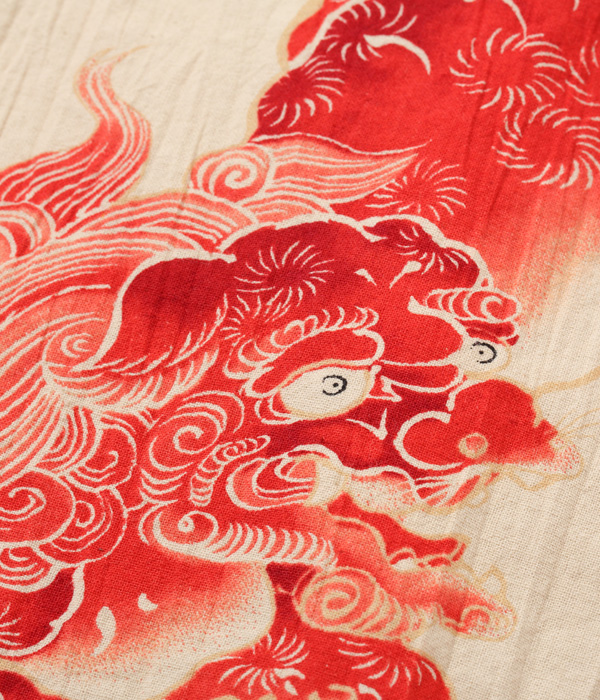 生地についてはヴィンテージに基づき、紡績や織りのみならず、独特のシワ感まで忠実に再現した。プリントについても友禅にみられる「防染」や、色をぼかして滲ませグラデーションを表現する「たたき」と呼ばれる手法を駆使しており、日本の高い捺染技術で鮮やかな朱赤に刷り上げられた唐獅子が強い存在感を放つ。