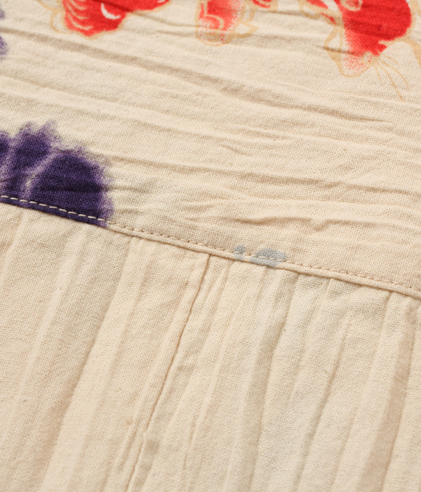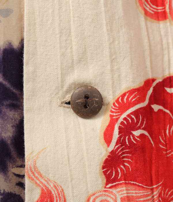 また当時、ハワイで日系のテーラーが手がけたハンドメイドの丁寧な作りも特徴。和装の生地は通常のシャツ生地よりも狭幅であるため、背中心で2枚の生地を接ぎ合わせる仕様となっている。日系移民の所有していた浴衣をリメイクしたものか、浴衣用の反物を使って作られたものかは不明だが、アロハシャツ草創期の歴史を紐解くうえで非常に貴重な逸品。