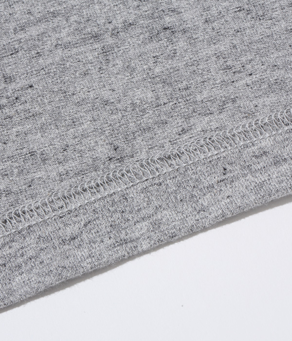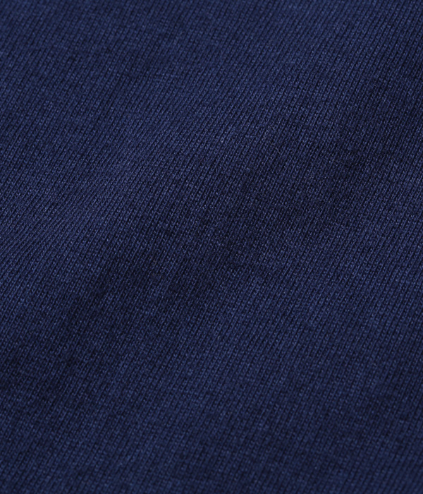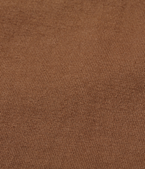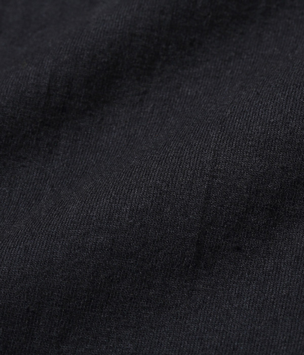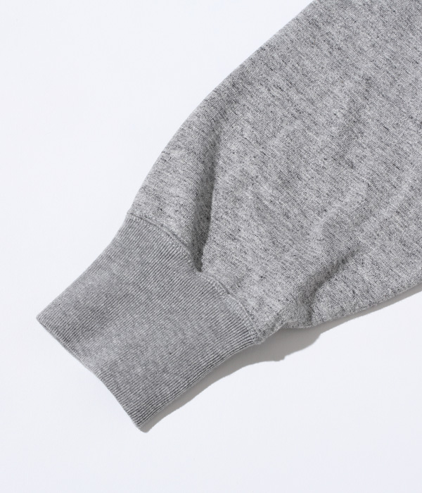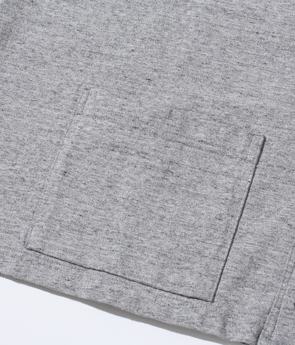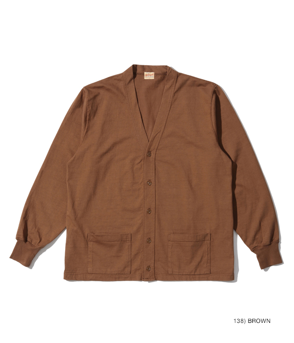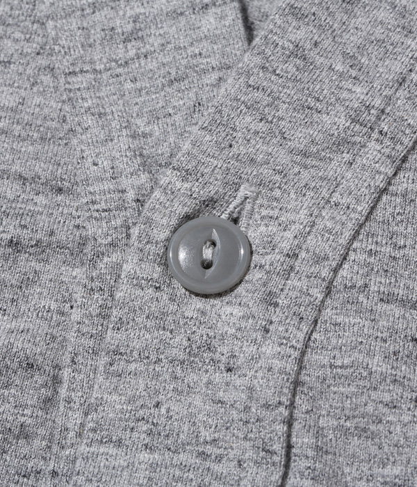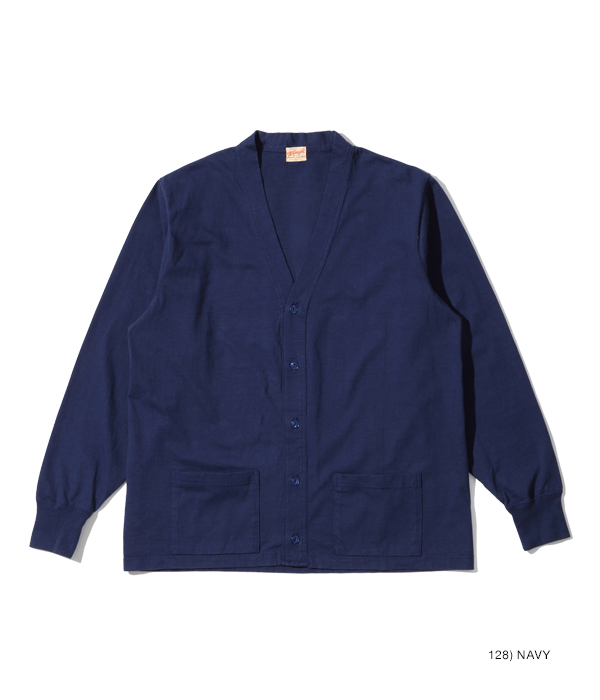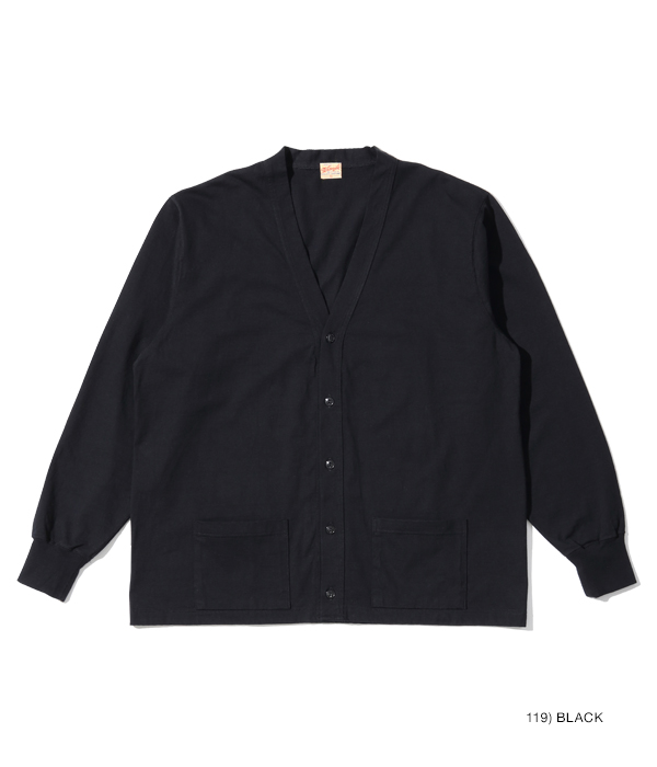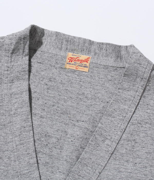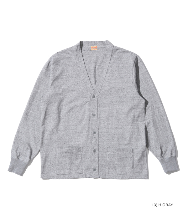 1950年代から’60年代にかけてアメリカの学生たちに人気を博したボタンカーディガン。本来はスウェット生地のアイテムだが、ホワイツビルのTシャツ用生地として人気を博している14番手の糸で編み立てたヘビー天竺でアレンジした。前立て部分には共生地でパイピングを施し、リブも14番手の糸で編み立てたリブを使用。フロントには猫目の尿素ボタンを使い、春に羽織る軽めのアウターとして最適な一着となっている。