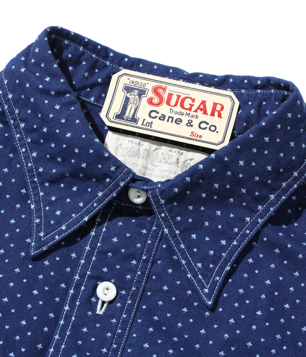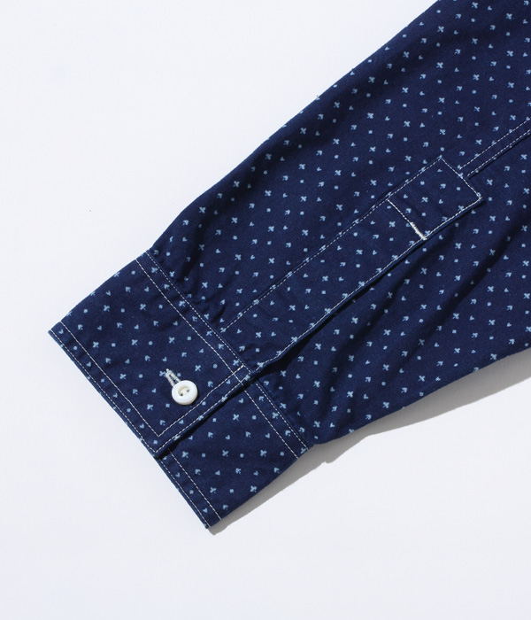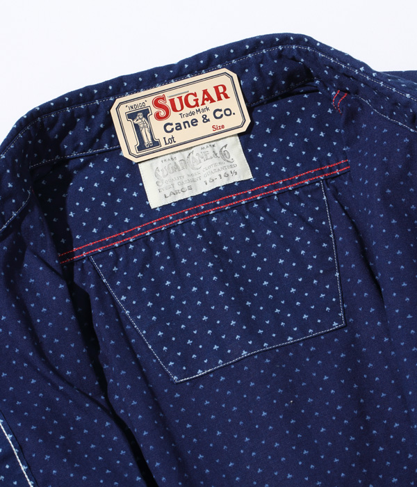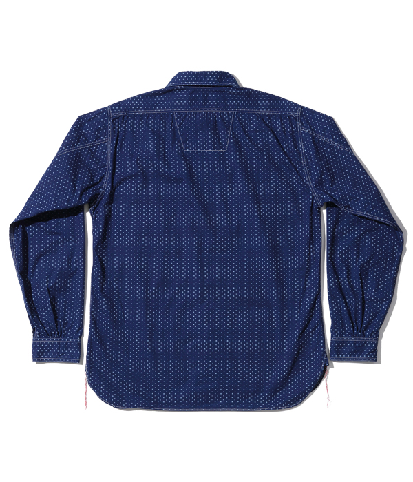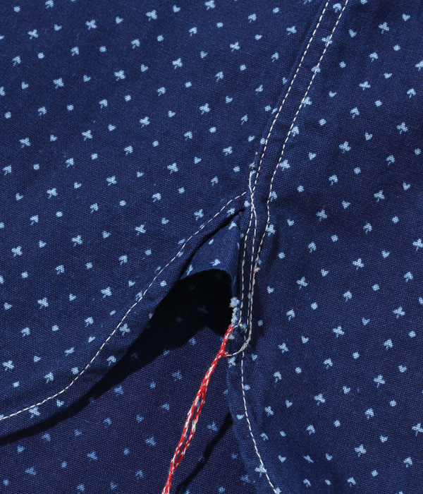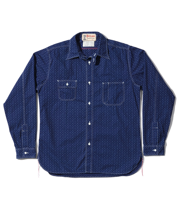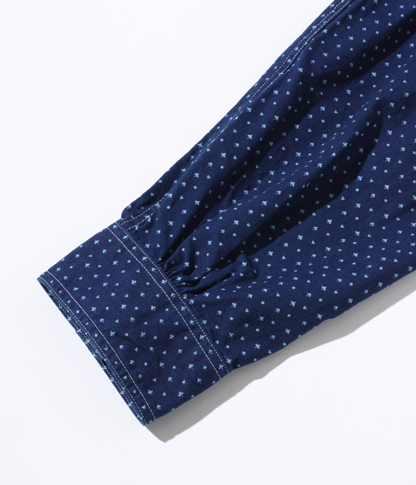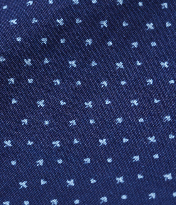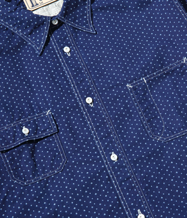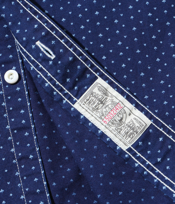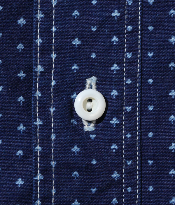 20世紀前半に実在した「カジノストライプ」のキャリコプリント生地を再現。4.5オンスの薄手のインディゴ生地に、♠♦♥♣マークを抜染(生地の色を白く染め抜くプリント手法)しており、軽やかなワークシャツに仕上げた。
