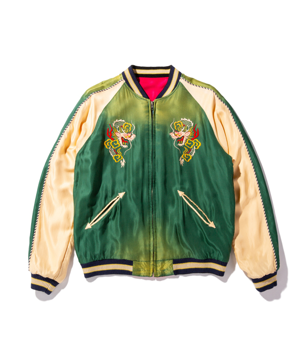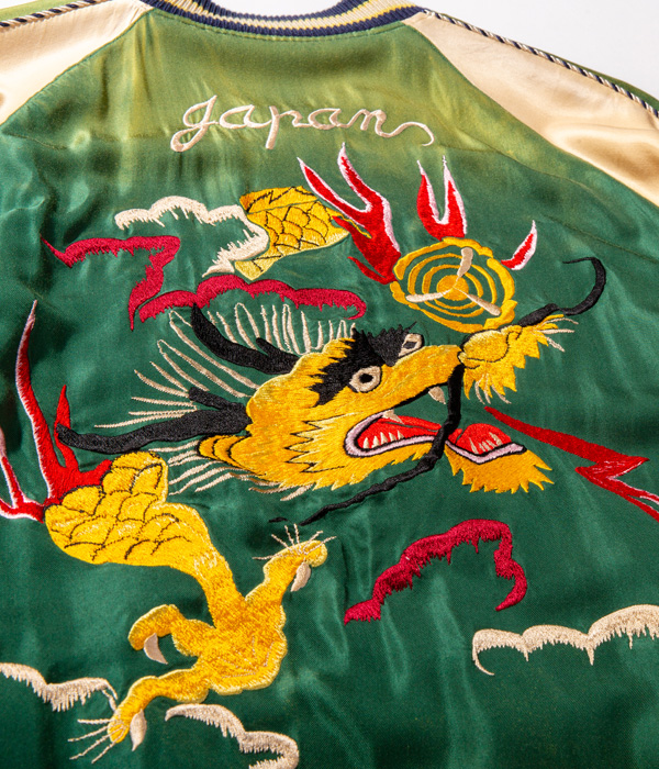 グリーンのアセテート生地にカラフルな色糸で龍を描いた1950年代中期の作品。発色が良いため一見すると派手な印象だが、エイジング加工により生地だけでなく刺繍糸も褪色して光沢感が和らぎ、深みのある色合いへと仕上がっている。