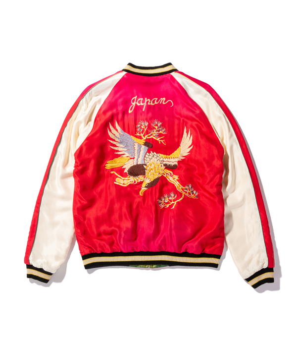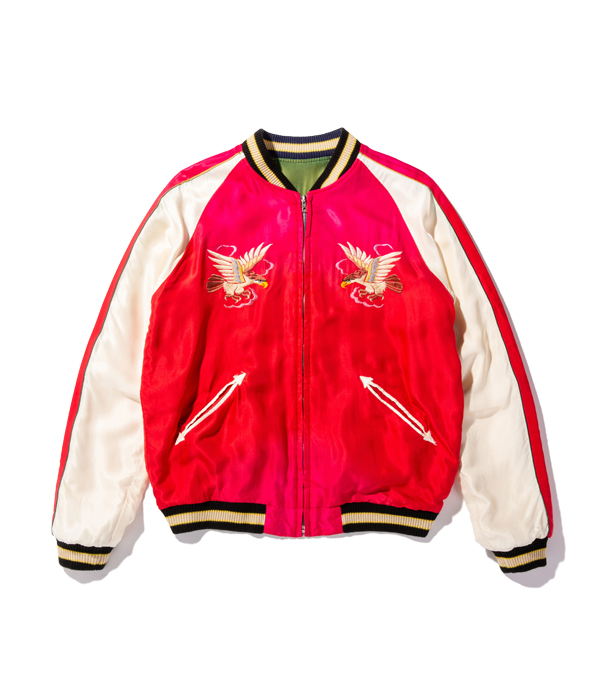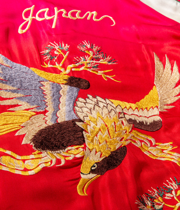 リバーシブル面もレッドのアセテート生地に対し、それに負けないほど鮮やかな色糸を使用。縫製後にエイジング加工で落ち着いた色味へと褪色させている。この首を捻った珍しいアングルの鷲の図案はヴィンテージでも珍しい。