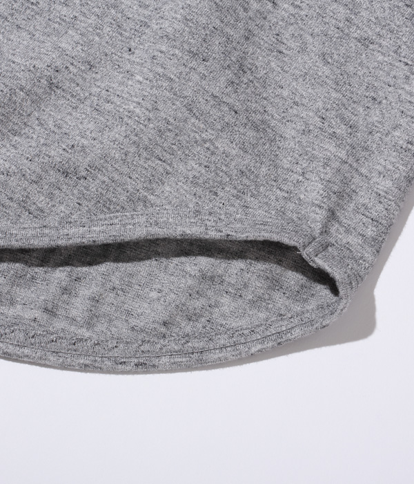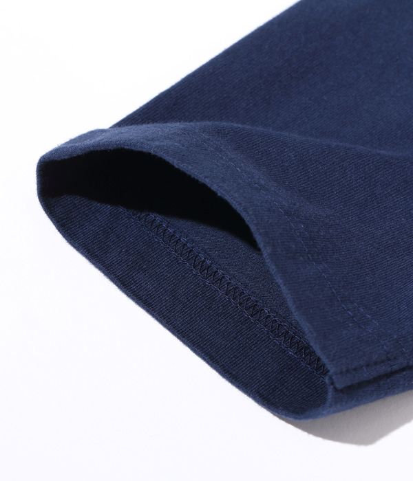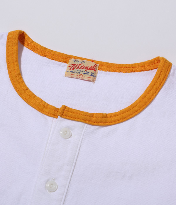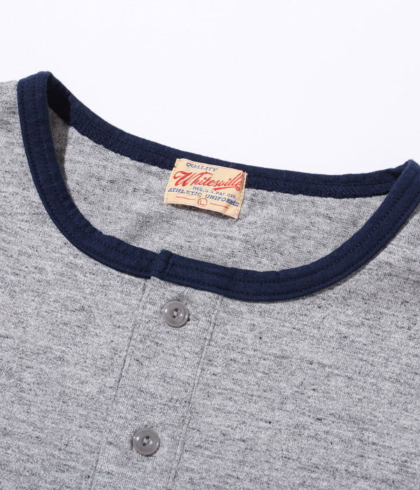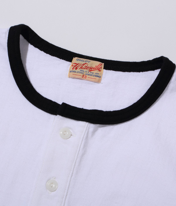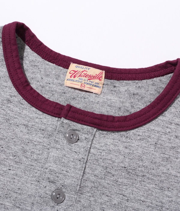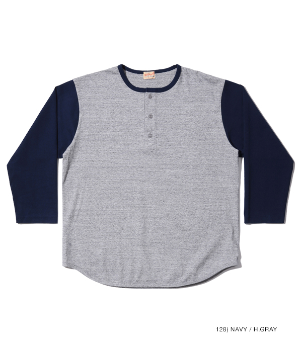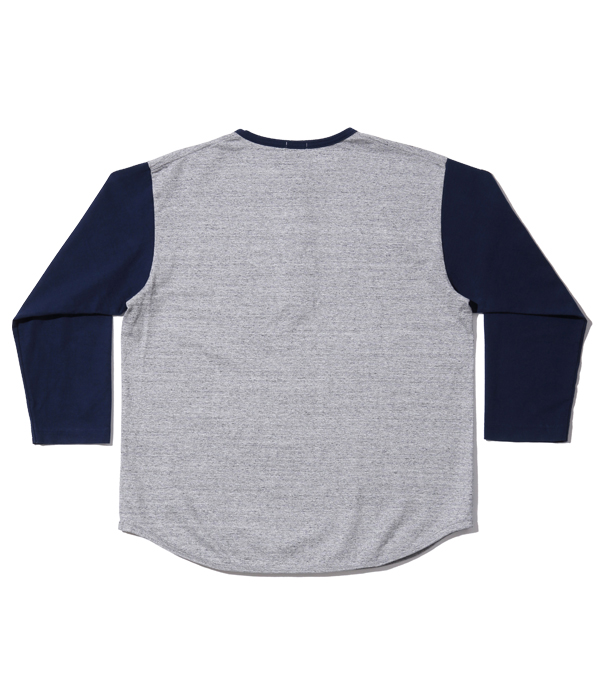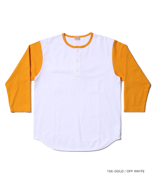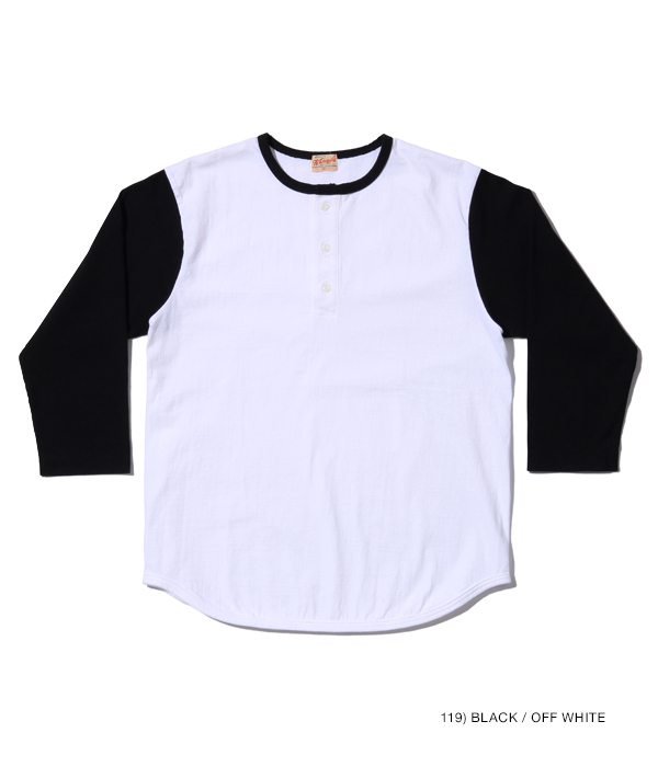 14番手の糸で編み立てたヘビー天竺生地のベースボールTシャツ。襟部分はリブではなく、袖と同じカラーの共生地を使用している。袖丈は7分袖で、首回りはボタン留めのヘンリーネック。身頃は丸胴仕様で、裾部分はめくれ上がりを防止するために共生地でパイピングを施している。