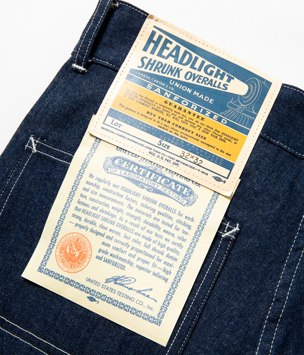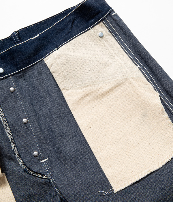 HEADLIGHTが展開していたカジュアルライン“HEADIES”の元となった1940年代後半のダンガリーパンツがベース。2WAYフラップポケットやツイントップボタンが特徴。当時の実物をもとに部材やディテールだけでなくフラッシャーまで再現しており、デッドストックのような佇まいを見せる。1950年代に入るとイエローステッチや、より賑やかなフラッシャーへと変更されるため、この仕様は’40sならでは。
