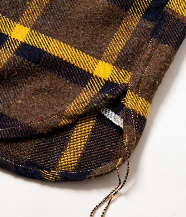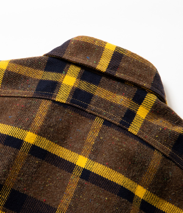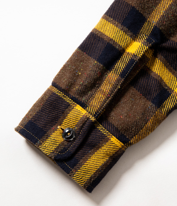 古着ではジャケットの裏地として度々登場する「トロイブランケット」。本来はウール製でボーダー柄の織物だが、それをコットンのチェック柄にアレンジし、ネルシャツへと仕上げた。多色で練り上げたマーブルボタンが生地のネップ感とマッチしている。