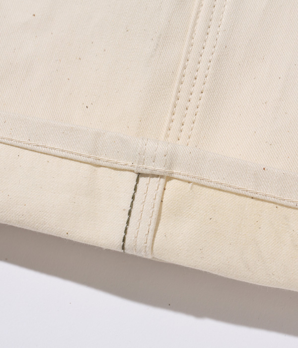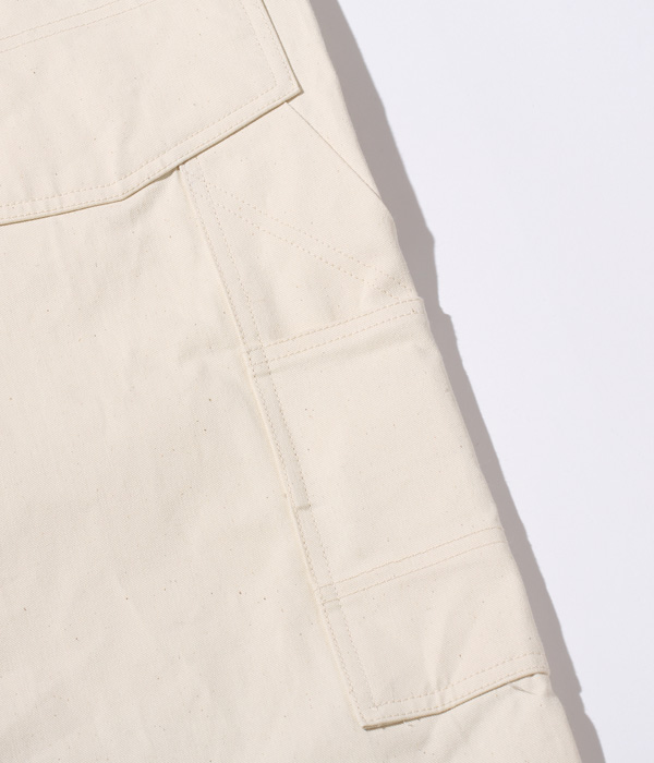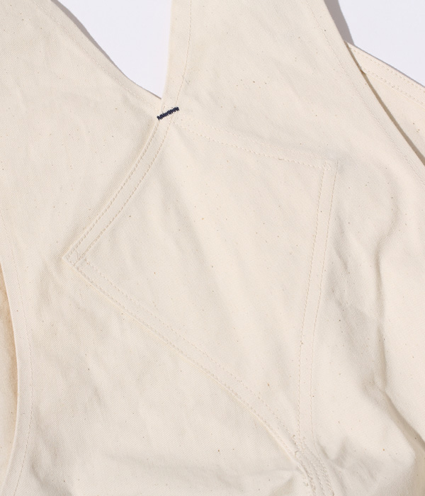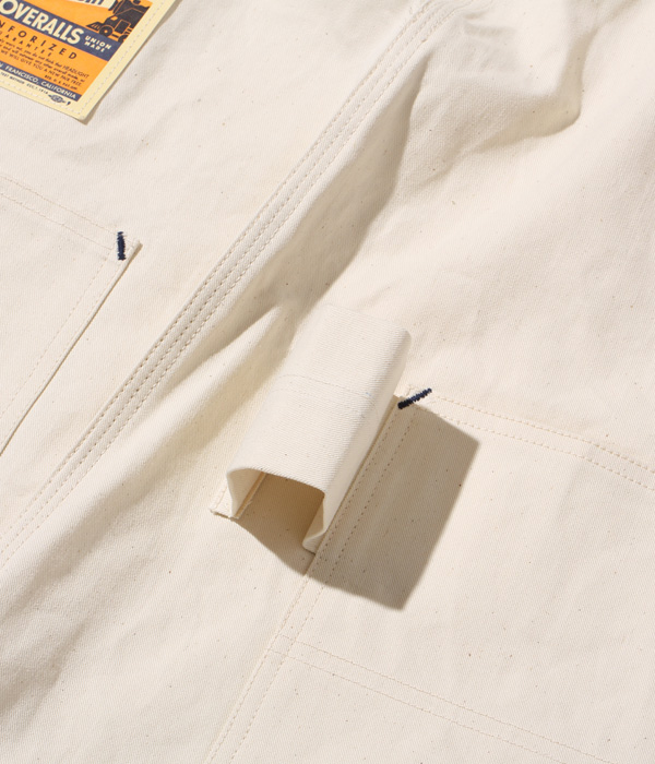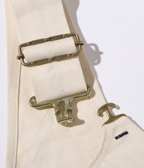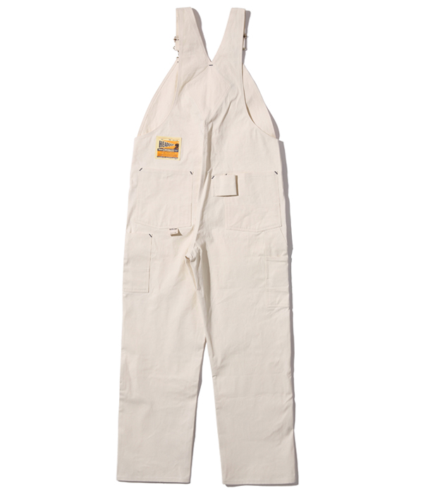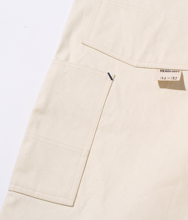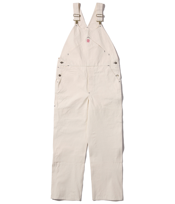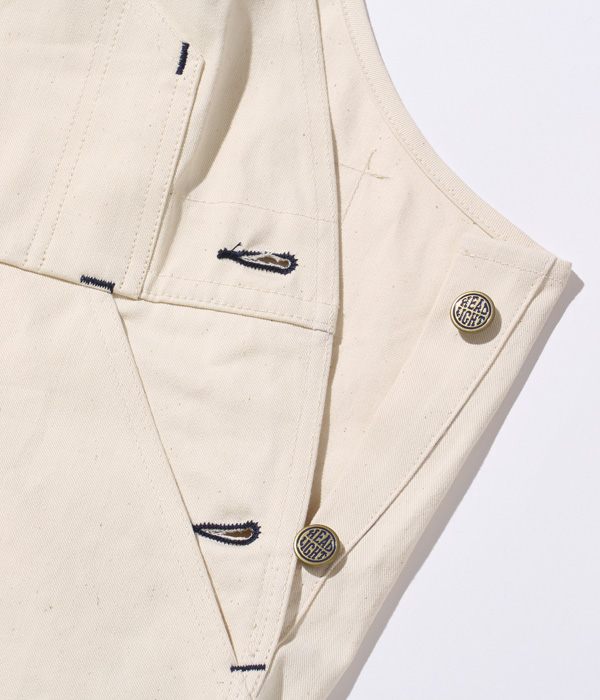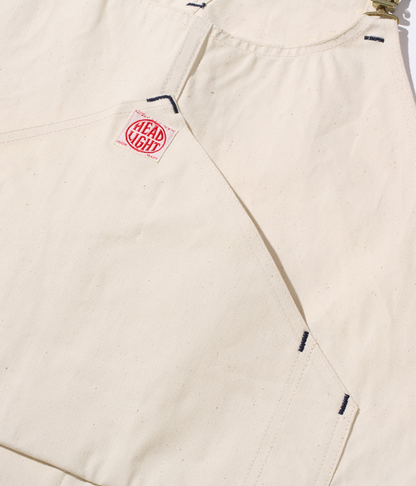 1940年代後半から1950年代にかけてヘッドライトが展開していた9オンスの生成ツイルで仕立てたペインター向けオーバーオール。ブラス製のアンカーフックやトライアングルポケットなど、胸当て部分が特徴。背中部分はハイバックオーバーオールの中でも「ダイヤモンドバック」と呼ばれる仕様となっている。腿から膝にかけて生地が二重となったダブルニーで、脇や内股、尻ぐりなどはトリプルステッチ、右ヒップポケット横には極太のハンマーループが付くなど、非常に丈夫な作り。サイドのボタンはロゴがブルーのブラスのタックボタンで、フロントフライは無地のドーナツボタン。ボタンホールや補強のカンヌキにはブルーの糸が使われ、全体のアクセントとなっている。
