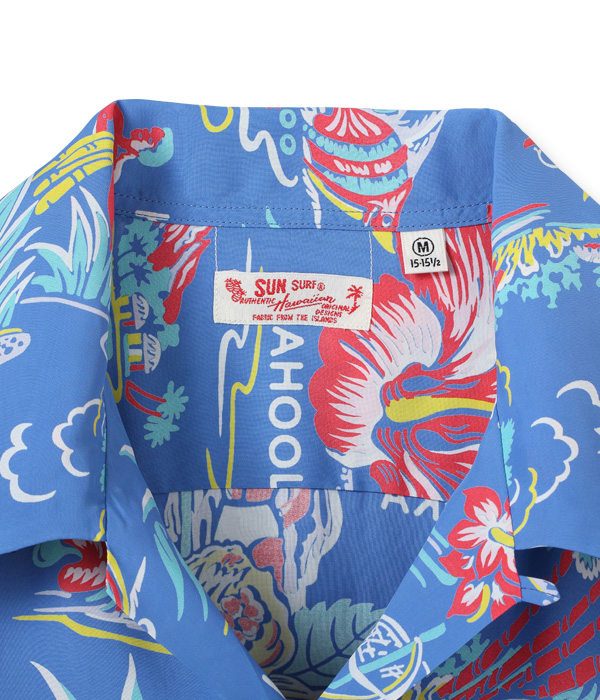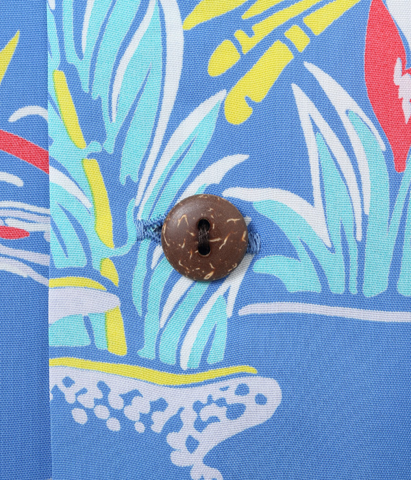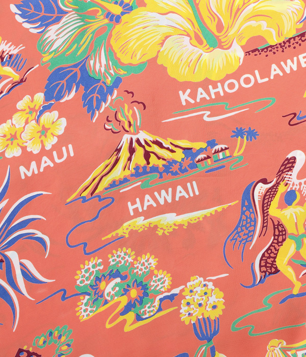 ハイビスカスをメインにカメハメハ大王やパイナップル、さらにはハワイ王家の紋章までもが描かれたコレクタブルな一枚。数あるオールオーバー・パターンの中でも、ハワイの象徴的なモチーフが多く盛り込まれた作品は当時から人気が高く、様々な配色が展開されていた。オリジナルを手がけたのは、日系のマーク・ヤマナカが率いていたハワイ島のブランド、オコレハオ。