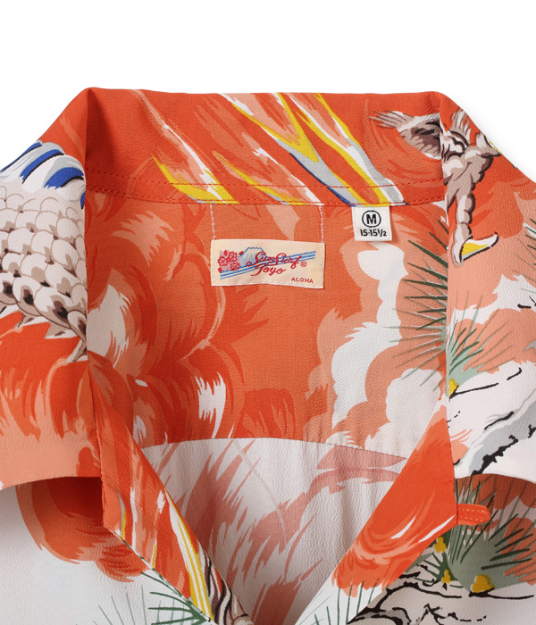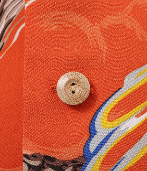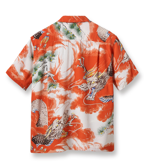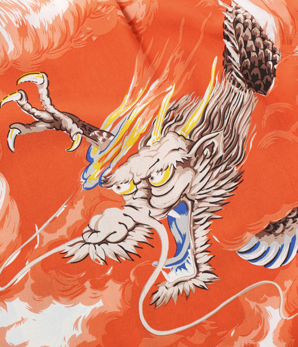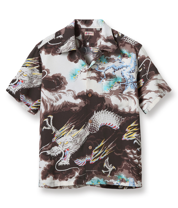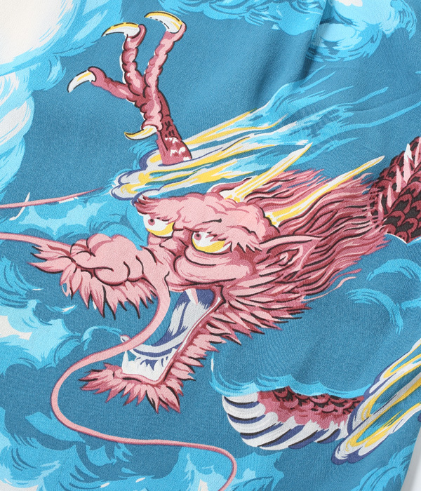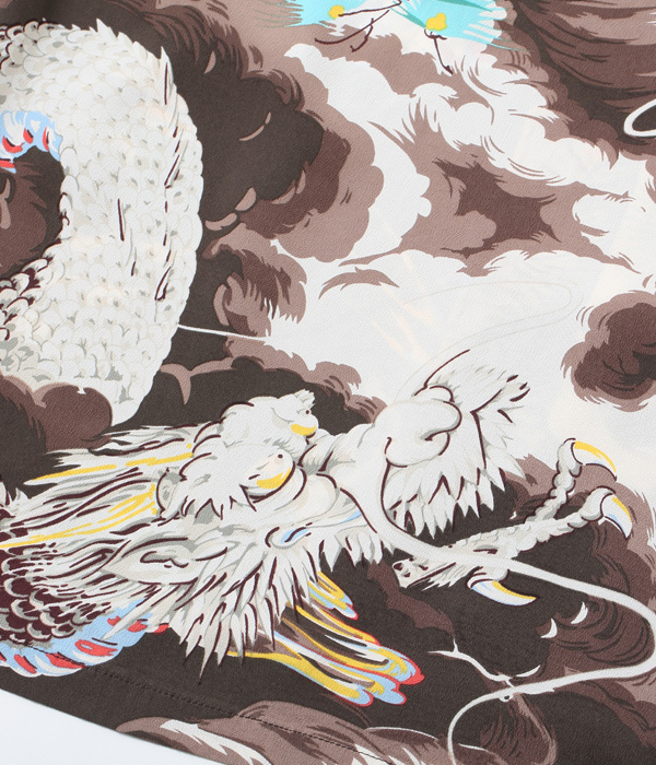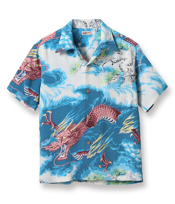 二匹の龍が雄叫びをあげて荒れ狂う様を描いた迫力あるこの絵柄は、1950年代初頭にパーム・ブリーズ・トッグスによって製作された。同ブランドの詳細には不明な点も多いが、奇抜な和柄の名作をいくつも残していることから、日系の生地コンバーターとの繋がりが深かったことがわかる。過去にサンサーフで復刻し、以降再復刻のリクエストが絶えない人気のデザイン。
